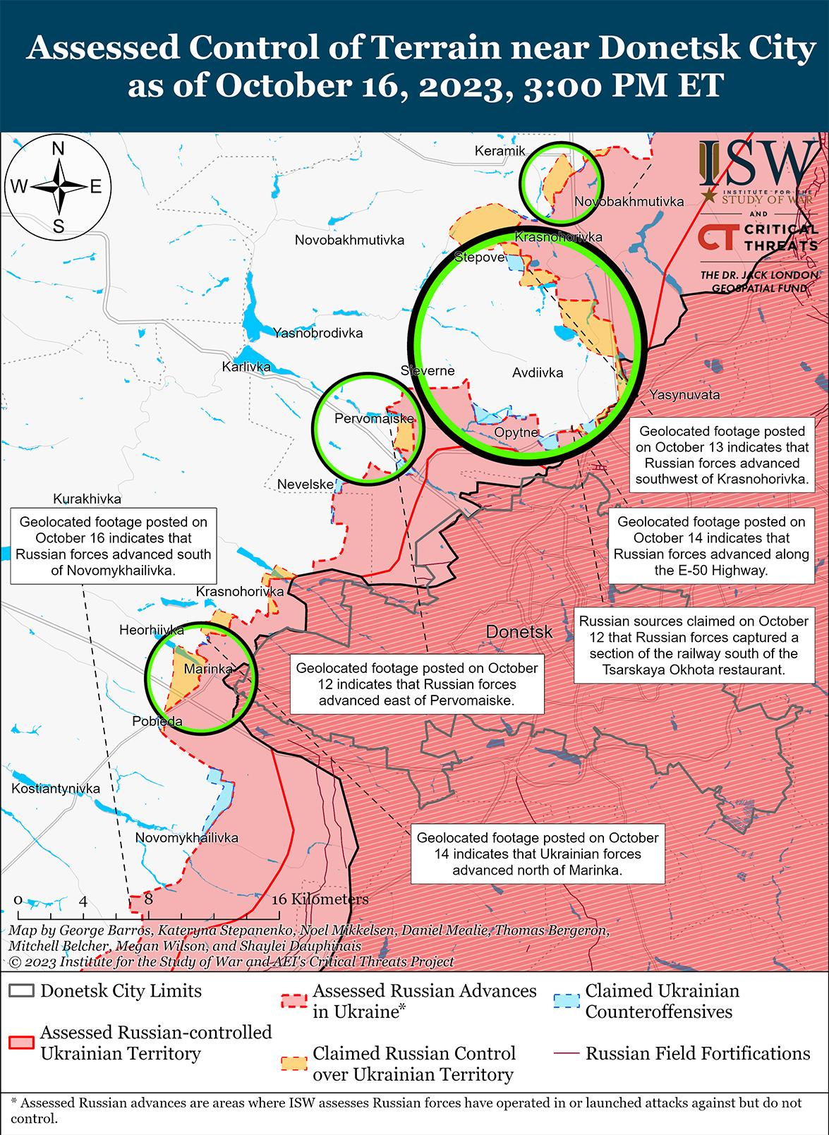 16 октября враг продолжил наступательные действия в районе Авдеевки и добился подтвержденных успехов на северных окраинах Донецка. На геолоцированных кадрах, опубликованных 16 октября, видно, что российские войска незначительно продвинулись дальше трассы Е50 примерно в 3 км к югу от Авдеевки. [40] Российские военные блогеры утверждали, что российские войска продолжают наносить удары по укрепрайону вокруг Авдеевки, обстреливая украинские логистические пути в населенный пункт. [41] Один из блогеров утверждал, что российские войска продолжают наземные атаки на нескольких направлениях, пытаясь окружить Авдеевку со стороны Северного (юго-запад), района Опытное — Спартак (юг) и Красногоровки (север). [42] Кроме того, автор статьи утверждал, что российские войска незначительно продвинулись в районе Степовое (7 км к северо-западу от Авдеевка), но не продвинулись в направлении Керамик (10 км к северо-западу от Авдеевка). [43] Кроме того, российские источники приводили противоречивые утверждения о статусе терриконика к северо-западу от Авдеевки: одни утверждали, что российские войска вообще не контролируют этот район, другие утверждали, что рядом с террикоником продолжаются бои и что российские войска продвигаются в оспариваемую «серую зону», а некоторые источники утверждали, что российские войска полностью контролируют терриконик. [44] Генеральный штаб Вооруженных сил Украины сообщил, что украинские силы отразили атаки противника вблизи Авдеевка, Керамик, Степное, Тоненькое (5 км к западу от Авдеевка), Северное (5 км к западу от Авдеевка) и Первомайское (10 км к юго-западу от Авдеевка). [45] Украинский офицер запаса отметил, что российские войска все чаще прибегают к массированным авиационным и артиллерийским ударам по инфраструктуре в районе Авдеевки из-за мощных украинских укреплений вокруг населенного пункта, которые затрудняют продвижение российских войск. [46]