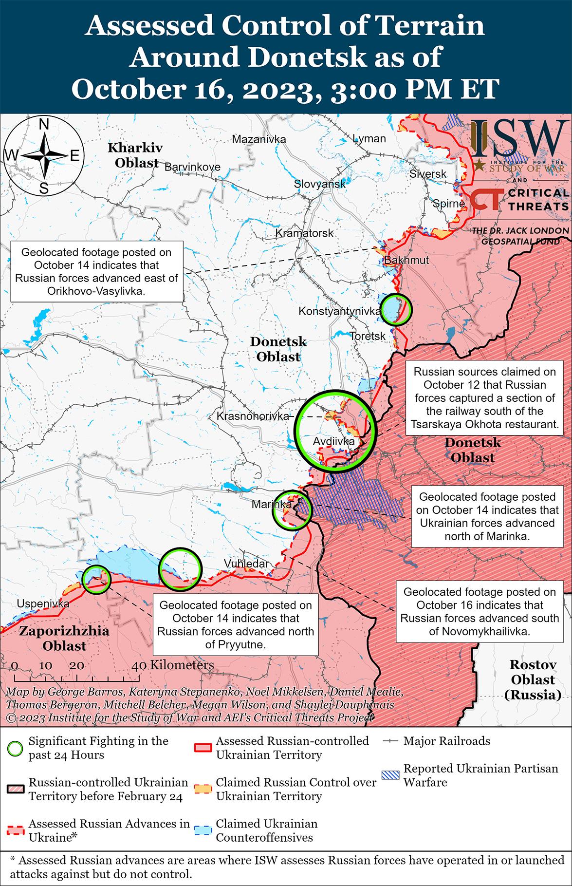 16 октября российские войска продолжили наступательные действия к юго-западу от Донецка и недавно продвинулись вперед. Геолоцированные кадры, опубликованные 13 октября, показывают, что российские войска контролируют Степное, населенный пункт примерно в 23 км к юго-западу от Донецка. [49] На дополнительных геолоцированных кадрах, опубликованных 16 октября, видно, что российские войска продвинулись к границе леса к югу от Новомихайловки, в 20 км к юго-западу от Донецка. [50] Генштаб ВСУ сообщал, что украинские силы отразили многочисленные атаки россиян в районе Марьинки (юго-западная окраина Донецка). [51] Российский военный блогер утверждал, что российские войска ведут «мощные» атаки на украинские позиции в Марьинке. [52]