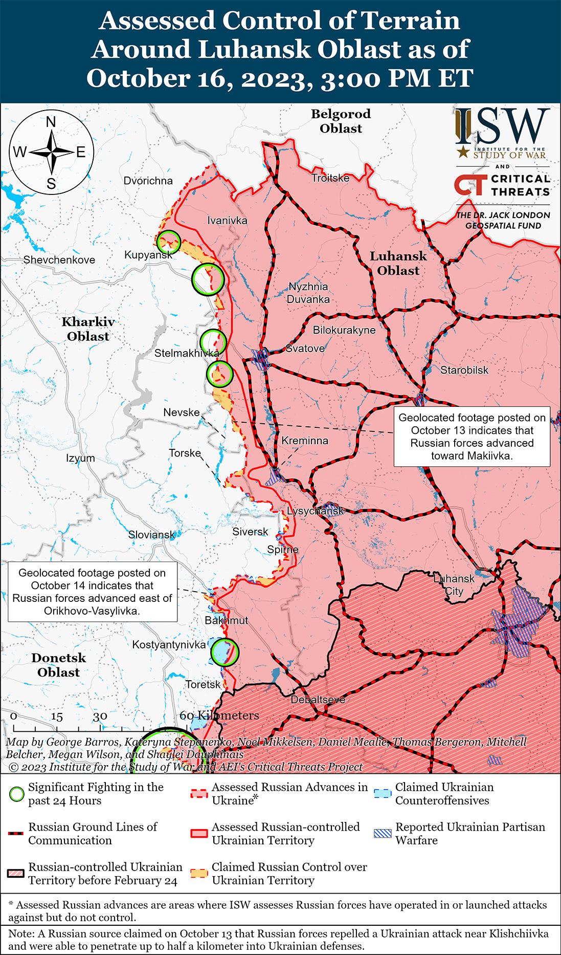 16 октября враг продолжил наступательные действия на линии Купянск — Сватово — Кременная, но не добился подтвержденных успехов. Российский военный блогер заявил, что российские войска захватили новые позиции в районах Крахмальное (25 км к юго-востоку от Купянска) и Степная Новоселка (17 км к юго-востоку от Купянска), но отметил, что российские войска не добились значительных успехов на Купянском направлении. [30] Другие российские военные блогеры сообщали о продолжении наступательных действий вблизи Синьковка (8 км к северо-востоку от Купянска), Лиман Перший (12 км к северо-востоку от Купянска), г. Макеевка (22 км к северо-западу от Кременной) и в районе Серебрянского лесничества (11 км к югу от Кременной). [31] Генштаб Вооруженных сил Украины сообщил, что украинские силы отразили атаки противника вблизи Синьковка, Ивановка (19 км к юго-востоку от Купянска), Стельмаховка (12 км к северо-западу от Сватово) и Надежда (20 км к западу от Сватово). [32] Украинский военный аналитик Петр Черник заявил, что российские войска концентрируют 100 000 человек личного состава на направлении Купянск-Лиман, чтобы отвлечь украинские силы от продолжающихся наступательных действий под Бахмутом. [33] Черник заявил, что российские войска могут добиться частичного успеха на направлении Купянск-Лиман, но для захвата территории им нужно будет выделить значительные силы.
