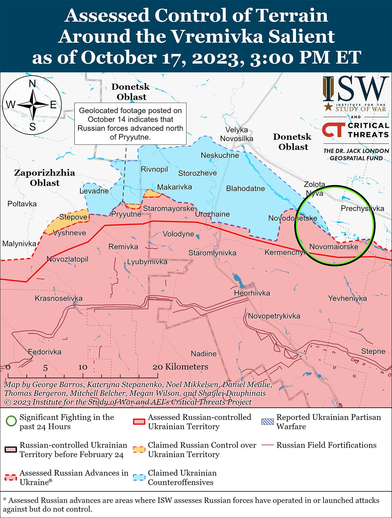 17 октября российские войска провели ограниченные наземные атаки в районе границы Донецкой-Запорожской областей, но не добились каких-либо подтвержденных успехов. Генеральный штаб Вооруженных сил Украины сообщил, что украинские силы отбили пять российских атак к югу от Золотая Нива (12 км к юго-востоку от Великая Новоселка) и Пречистовка (17 км к юго-востоку от Великая Новоселка). [60] 16 октября российский военный блогер заявил, что российские войска пытались улучшить свои тактические позиции в районе Приютного и Новомайорского (18 км к юго-востоку от Великой Новоселки). [61]