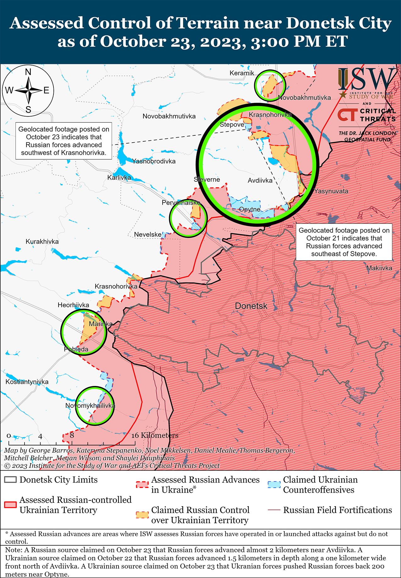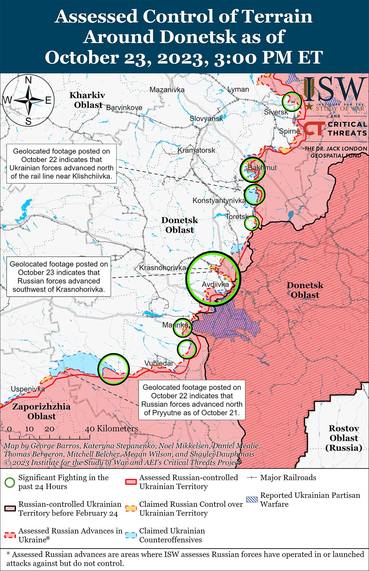 Враг вел наступательные действия вблизи Авдеевки и 23 октября добился подтвержденных успехов. Геолоцированные кадры, опубликованные 23 октября, свидетельствуют о том, что российские войска продвинулись к юго-западу от Красногоровки (5 км к северо-востоку от Авдеевки). [43] Российские источники утверждали, что за последние несколько дней российские войска продвинулись в районе Авдеевки почти на два километра. [44] Российские военные блогеры утверждали, что российские войска продвинулись в районе Первомайское (11 км к юго-западу от Авдеевки) и к железнодорожной ветке к северу от района террикона к северо-западу от Авдеевки. [45] Украинский источник заявил, что террикон является спорной «серой зоной», а российский военный блогер заявил 22 октября, что российские войска не могут взять его под контроль из-за интенсивного огня украинской артиллерии. [46] Другой российский блогер заявил 22 октября, что на прошлой неделе российские войска прорвались к террикону и железной дороге в районе Степовое (8 км к северо-западу от Авдеевки) и оттеснили украинские войска в районе Северного (6 км к западу от Авдеевки) и Спартака (4 км к югу от Авдеевки). [47] 23 октября украинский источник сообщил, что российские войска, в том числе подразделения 9-й мотострелковой бригады (1-й армейский корпус ДНР), 110-й мотострелковой бригады (1-й армейский корпус ДНР) и 55-й мотострелковой бригады (41-я общевойсковая армия, Центральный военный округ), продвинулись в районе населенных пунктов Оптино (4 км южнее Авдеевки) и Водяное (7 км юго-западнее Авдеевки). [48] Машовец утверждал, что подразделения российской 1-й мотострелковой бригады и 9-й мотострелковой бригады (обе входят в состав 1-го армейского корпуса ДНР) оттеснили украинские силы на 200 метров в районе Опытное (4 км южнее Авдеевки), а подразделения 114-й мотострелковой бригады (1-й армейский корпус ДНР) закрепились западнее Красногоровки. [49] Российский блогер утверждал, что российские войска атаковали вблизи Степного, Новокалиново (7 км к северу от Авдеевки), Северного и к югу от Авдеевки. [50] Украинские источники, в том числе Генштаб ВСУ, сообщали, что российские войска безуспешно атаковали вблизи Керамик (10 км северо-западнее н.. Авдеевка), Степное, Тоненькое (5 км к западу от Авдеевка), Опытное, Первомайское и к югу от ресторана «Царская охота» к югу от Авдеевка. [51] Российский блогер утверждал, что в районе Авдеевки действуют боевики подконтрольной Минобороны РФ частной военной компании (ЧВК) «Редут». [52] Украинский источник сообщил, что российские войска формируют штурмовые группы, в том числе части 106-й дивизии ВДВ и 1-го армейского корпуса. [53] Машовец заявил, что с Лиманского направления в район Авдеевки также были переброшены подразделения российской 21-й мотострелковой бригады (2-я общевойсковая армия). [54]