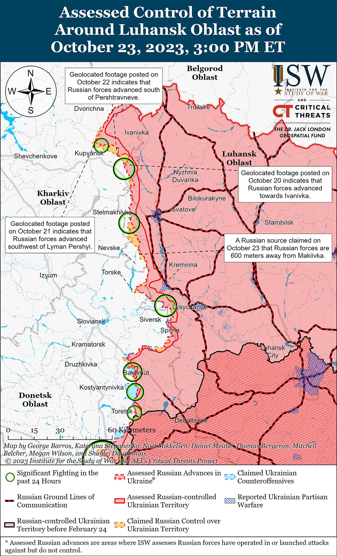23 октября враг вел наступательные действия на участке Сватово-Кременная, но не добился подтвержденных успехов. Российский блогер заявил, что российские войска находятся в 600 метрах от Макеевки (20 км к юго-западу от Сватово), хотя ISW может подтвердить только то, что российские войска удерживают позиции в пределах 2 км от Сватово в ближайшей точке. [26] Другой российский блогер утверждал, что на прошлой неделе российские войска добились ограниченных успехов в Серебрянском лесничестве (11 км к югу от Кременной). [27] Генштаб Вооруженных сил Украины сообщил, что украинские силы отразили атаки противника вблизи Надежда (15 км западнее Сватово) и Серебрянского лесничества. [28] Российский блогер заявил, что бои продолжаются на Северском направлении (19 км южнее Кременной). [29]