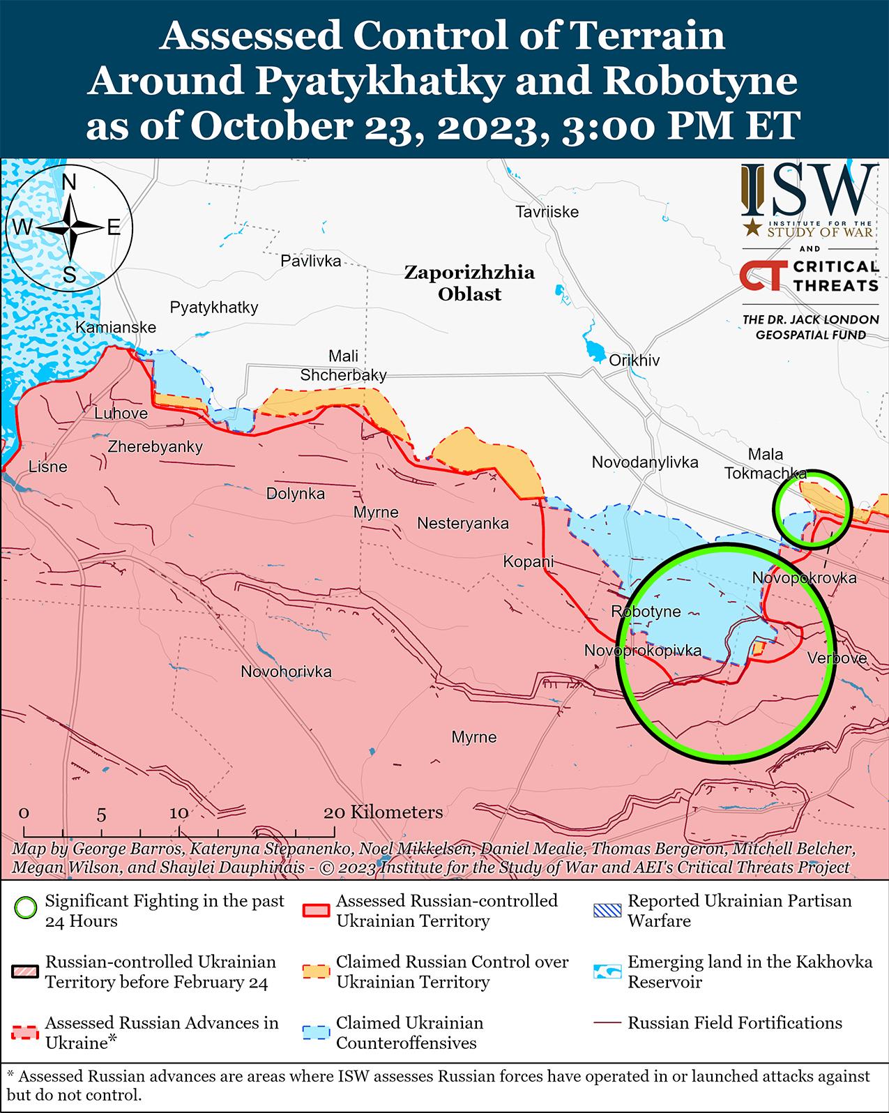 23 октября украинские силы продолжили наступательные действия на западе Запорожской области, но не добились каких-либо заявленных или подтвержденных успехов. Украинский Генштаб сообщил, что украинские войска продолжают наступательные действия на Мелитопольском (Западно-Запорожском) направлении. [72] Минобороны России заявило, что российские войска отразили украинскую атаку в районе Роботино. [73] Несколько российских военных блогеров утверждали, что украинские войска наносили удары по линии Роботино-Вербовое и северо-западу от Роботино в направлении Копани (5 км к северо-западу от Роботино), но российские войска отбили атаки. [74] Российский военный блогер утверждал, что на участке фронта Жеребрианский – Пятихатки к западу от Роботино продолжаются локальные и позиционные атаки. [75]