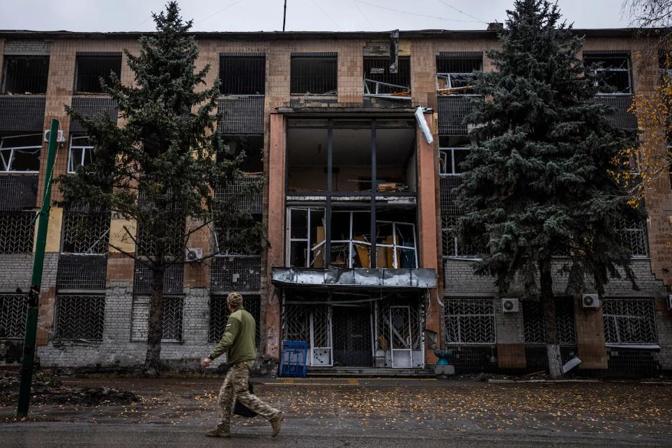 Солдат проходит мимо поврежденного здания в Купянске. (Эд Рам для The Washington Post)