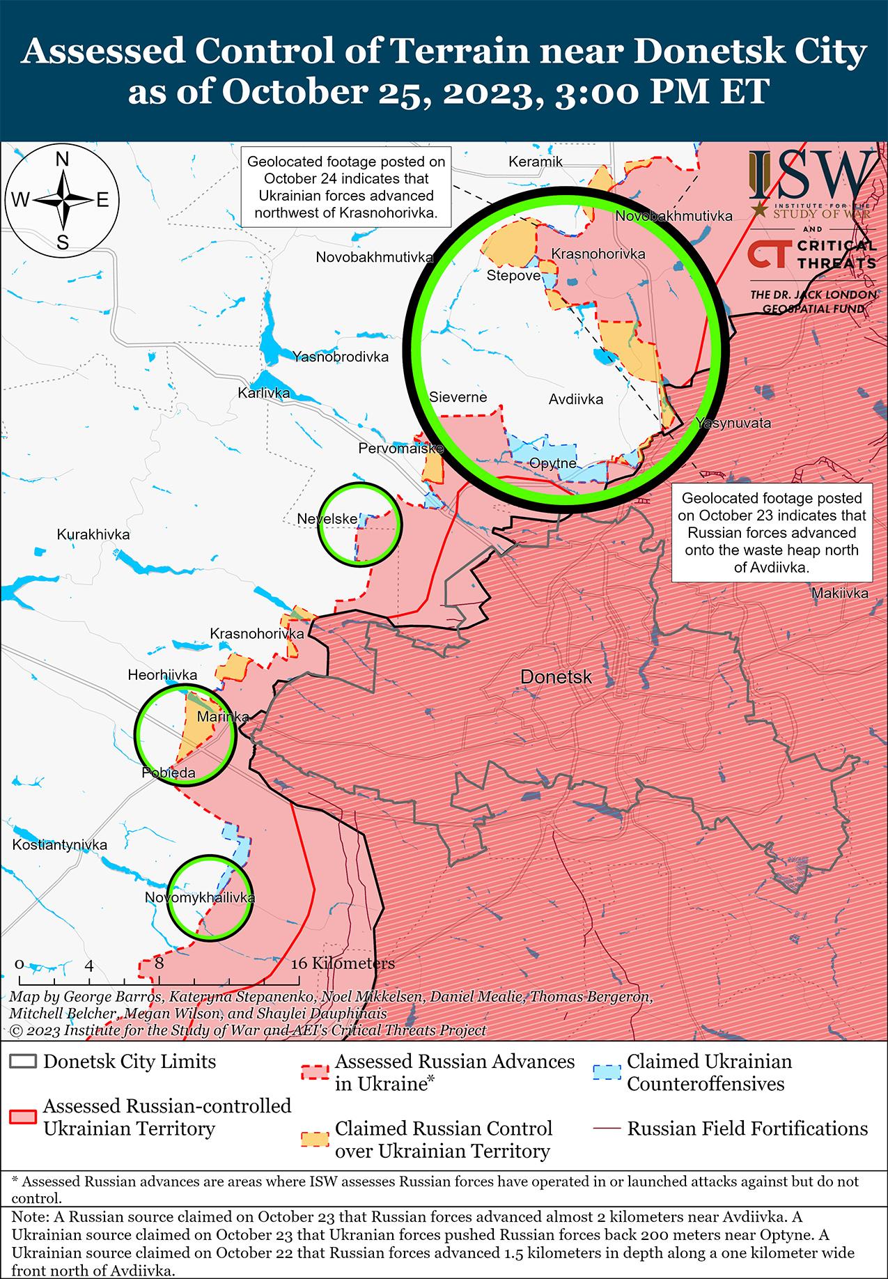 25 октября враг вел наступательные действия вблизи Авдеевки и подтвердил наступление. Геолоцированные кадры, опубликованные 24 октября, свидетельствуют о том, что российские войска продвинулись к северо-западу от Красногоровки (5 км к северо-западу от Авдеевки). [30] Генштаб Вооруженных сил Украины сообщил, что российские войска безуспешно атаковали вблизи Степное (3 км к северо-западу от Авдеевки), Авдеевка, Тоненькое (5 км к западу от Авдеевка), Северное (6 км к западу от Авдеевка) и Невельское (13 км к юго-западу от Авдеевка). [31] Спикер Таврийской группировки войск Украины полковник Александр Штупун заявил 24 октября, что частота российских атак в районе Авдеевки снизилась. [32] 25 октября известный российский военный блогер заявил, что российские войска добились «серьезного тактического успеха» на подступах к Авдеевке и под Степовым и продвинулись к железнодорожной ветке к северу от Авдеевки. [33] Другой российский блогер утверждал, что российские войска продвигаются от Красногоровки до Новокалиново (7 км к северу от Авдеевки). [34] Российские войска в основном утверждали, что российские войска контролируют террикон в Авдеевке, как и украинский военный наблюдатель. [35] Глава украинской Авдеевской городской военной администрации Виталий Барабаш опроверг утверждения о том, что российские войска контролируют Авдеевский террикон, и заявил, что он является спорной «серой зоной». [36] Другой украинский военный обозреватель заявил 25 октября, что остатки ЧВК «Вагнер» ведут бои под Авдеевкой, хотя ISW не обнаружил доказательств того, что бывшие бойцы «Вагнер» действовали вблизи Авдеевки. [37]