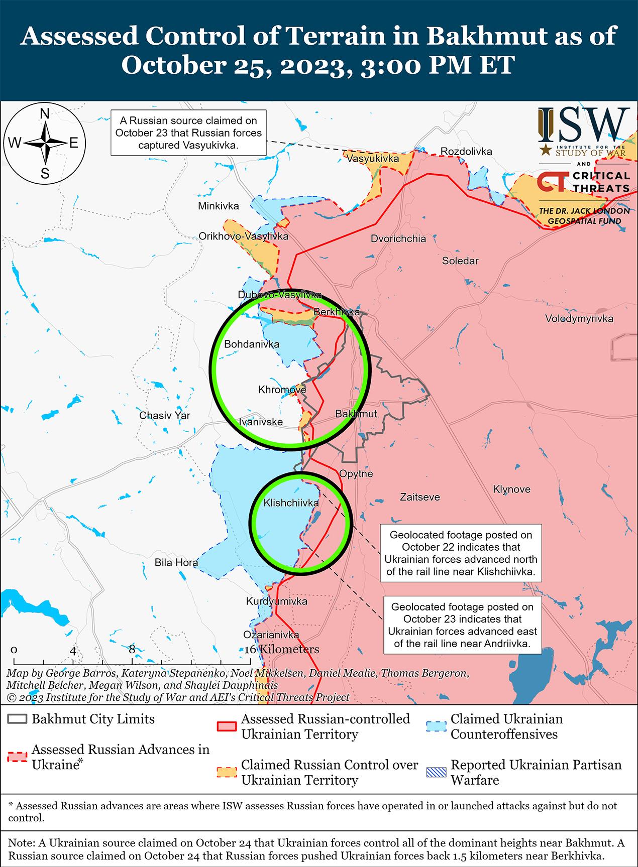 25 октября украинские силы продолжили наступательные действия в районе Бахмута, но не добились каких-либо заявленных или подтвержденных успехов. В украинском Генштабе сообщили, что украинские силы продолжают наступательные действия на Бахмутском направлении. [23] 24 октября пресс-секретарь Сухопутных войск Украины подполковник Владимир Фитё заявил, что украинские войска ведут наступательные действия в районах населенных пунктов Клещеевка (7 км к юго-западу от Бахмута) и Андреевка (10 км юго-западнее Бахмута). [24] Фитё заявил, что бои происходили также в районе Хромова (непосредственно к западу от Бахмута). [25] Министерство обороны России заявило, что российские войска отразили украинские атаки вблизи Малоилиновки (4 км к северу от Бахмута), Андреевки, Курдюмовки (13 км к юго-западу от Бахмута) и Северного (20 км к юго-западу от Бахмута). [26]
