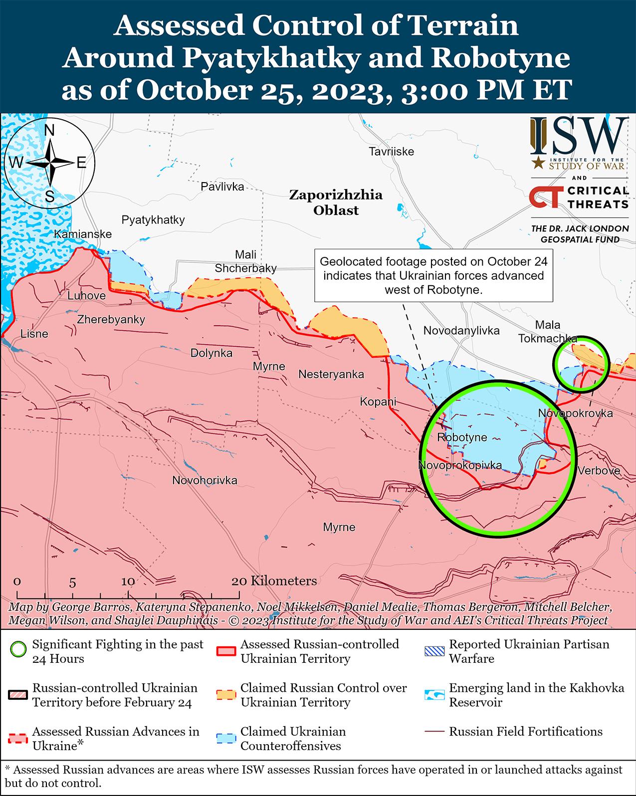 25 октября российские войска перешли в контрнаступление на западе Запорожской области, но не добились каких-либо подтвержденных успехов. Генштаб Вооруженных сил Украины сообщил, что украинские силы отбили атаки россиян в районе Вербовое и юго-восточнее Малая Токмачка (10 км к северо-востоку от Роботино). [52] Российский военный блогер утверждал, что российские войска контратаковали на украинском фланге в районе Новопокровки (12 км к северо-востоку от Роботино), но не уточнял результат. [53]