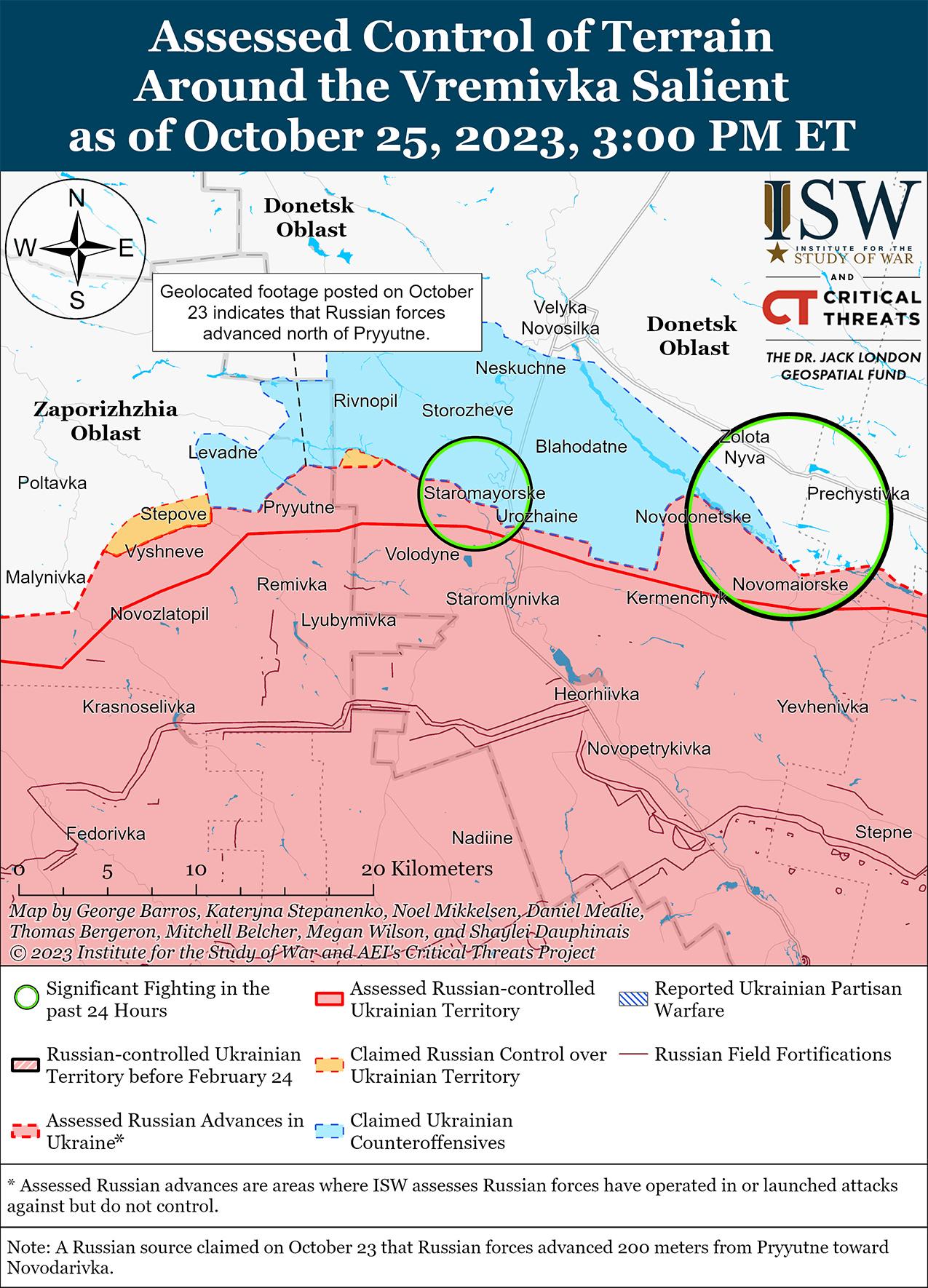 25 октября российские войска продолжили ограниченные наземные атаки на приграничном участке Донецкой-Запорожской областей, но не добились каких-либо подтвержденных успехов. Генеральный штаб Вооруженных сил Украины сообщил, что враг вел безуспешные наступательные действия вблизи Новоукраинка (18 км к востоку от Великая Новоселка), Пречистовка (19 км к юго-востоку от Великая Новоселка), Старомайорское (9 км к югу от Великая Новселка) и Золотая Нива (11 км к юго-востоку от Великая Новоселка). [42] Депутат оккупационной власти Запорожской области Владимир Рогов заявил, что российские войска успешно атаковали в районах населенных пунктов Приютное (14 км к юго-западу от Великой Новоселки) и Новодаровка (15 км к юго-западу от Великой Новоселки) и продвинулись на 200 метров. [43] Российские военные блогеры также утверждали, что российские войска продвинулись севернее Приютного, а один из них утверждал, что части 394-го мотострелкового полка (127-я мотострелковая дивизия, 5-я общевойсковая армия, Восточный военный округ) заняли украинский опорный пункт в этом районе. [44] Украинский военный обозреватель констатировал, что подразделения 394-го мотострелкового полка и 60-й мотострелковой бригады (также 5-й общевойсковой армии Восточного военного округа) вели безуспешные наступательные действия на участке Приютное – Завитне Бажання (14 км юго-западнее и 11 км южнее Великой Новоселки). [45] По словам Рогова, российские войска также провели успешные наступательные действия вблизи Новодонецкое (12 км к юго-востоку от Великая Новоселка) и Новомайорское (18 км к юго-востоку от Великая Новоселка), хотя другой блогер назвал российские атаки вблизи этих населенных пунктов безуспешными. [46]
