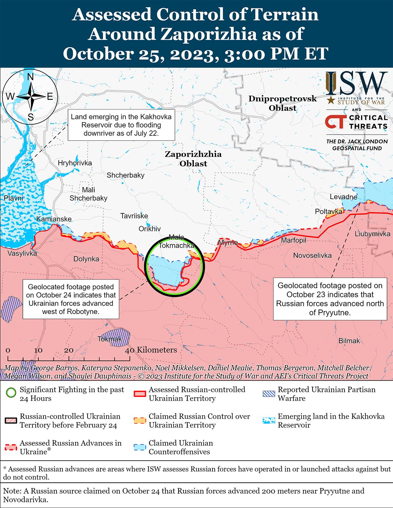 Украинские силы незначительно продвинулись на западе Запорожской области и 25 октября продолжили наступательные действия в районе Бахмута. Геолоцированные кадры, опубликованные 24 октября, указывают на то, что украинские силы продвинулись дальше к западу от Роботино. [1] Генеральный штаб Вооруженных сил Украины сообщил, что украинские силы также добились неопределенного частичного успеха к западу от Вербовое (9 км к западу от Роботино). [2] Пресс-секретарь Сухопутных войск Украины подполковник Владимир Фитё заявил 24 октября, что украинские войска ведут наступательные действия в районах населенных пунктов Клещеевка (7 км к юго-западу от Бахмута) и Андреевка (10 км к юго-западу от Бахмута). [3]