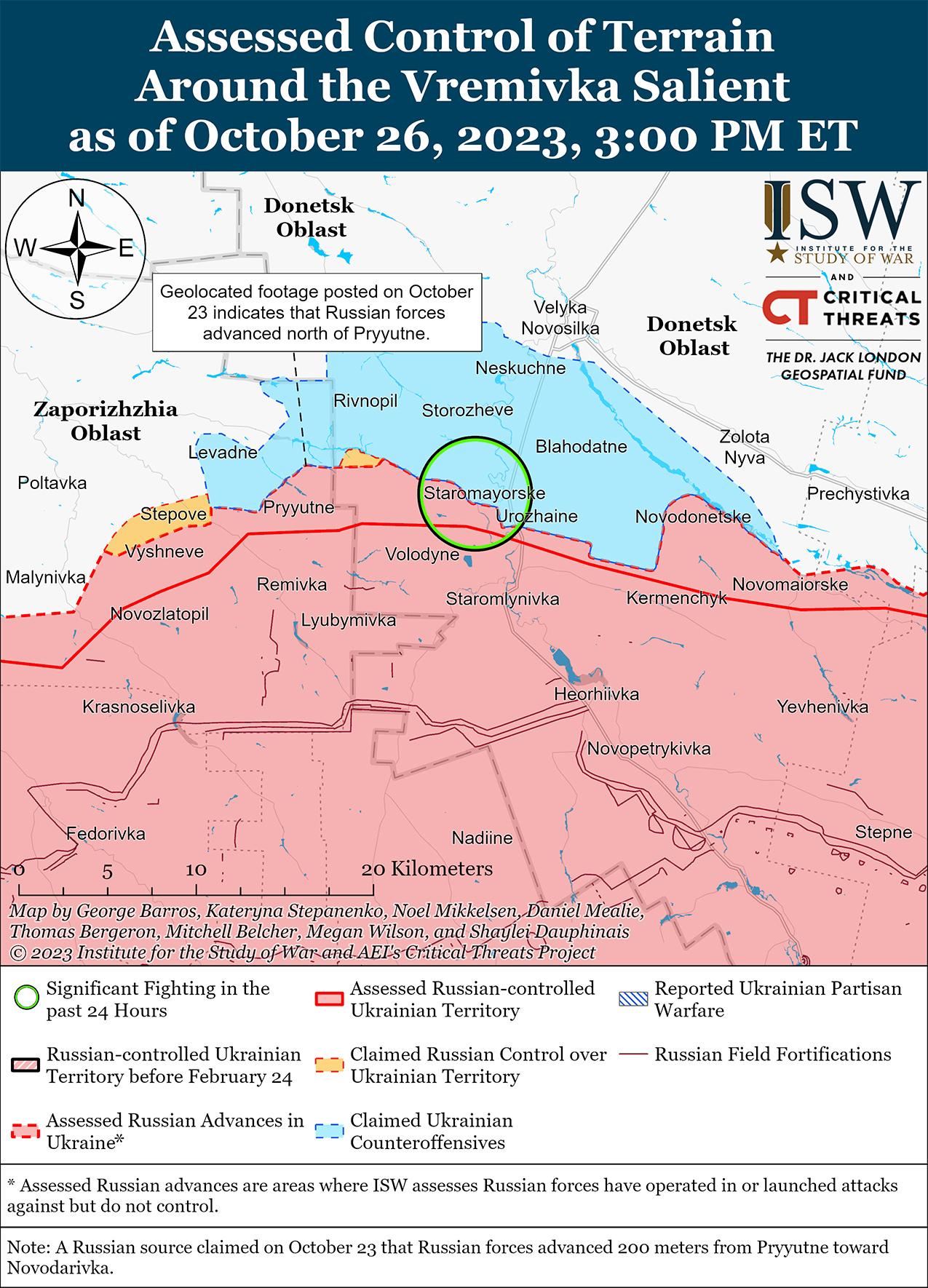 Российские войска вели наступательные действия вблизи Авдеевки, но 26 октября не добились подтвержденных успехов. Российские военные утверждали, что российские войска продвинулись к северо-востоку от Первомайское (11 км к юго-западу от Авдеевка) и продвинулись в направлении Северное (6 км к западу от Авдеевка). [46] Украинский офицер запаса заявил 25 октября, что российские войска постепенно продвигаются к Степовому, несмотря на значительные потери. [47] 26 октября российские источники утверждали, что российские войска расширили контроль над железнодорожной веткой в районе Степного. [48] Украинский военный обозреватель заявил 25 октября, что российские войска захватили участок шириной в один километр вдоль железной дороги. [49] 25 и 26 октября российские источники утверждали, что российские войска продолжают наступление в районе террикона к северо-западу от Авдеевки и успешно обороняют там свои позиции. [50] 25 октября украинский офицер запаса заявил, что российские войска могут использовать эти позиции лишь эпизодически и временно, и что ни российские, ни украинские силы не контролируют террикон в полном объеме. [51] Генштаб Вооруженных сил Украины сообщил, что российские войска безуспешно атаковали вблизи населенных пунктов Степное, Авдеевка, Тоненькое (5 км к западу от Авдеевки) и Северное (6 км к западу от Авдеевки). [52] Спикер украинской Таврийской группировки войск полковник Александр Штупун 25 и 26 октября заявил, что российские войска с других направлений заменяют российские батальоны, понесшие потери в районе Авдеевки, а отряды заключенных “Шторм-Z” отказываются вести боевые действия и оставляют позиции в районе Авдеевки. [53] 26 октября российский блогер заявил, что российские войска контролируют огнем более 90% украинских наземных коммуникаций в районе Авдеевки, однако ISW не обнаружил никаких признаков того, что продолжающиеся заявления России о том, что Россия осуществляет огневой контроль над украинскими НЛК в районе Авдеевки, соответствуют действительности. [54] Военный блогер также утверждал, что бывшие бойцы ЧВК «Вагнер» ведут бои под Авдеевкой, хотя ISW также не обнаружил доказательств этого утверждения. [55] Другой российский блогер утверждал, что в районе Красногоровка (1 км к северо-западу от Авдеевки) действуют подразделения российского диверсионно-разведывательного отряда «Клуны» и разведывательной группы «Скиф» (вероятно, 5-го армейского корпуса ДНР). [56] 25 октября украинские источники сообщали, что вблизи Авдеевки действуют подразделения российской 110-й механизированной бригады (1-й армейский корпус ДНР). [57] 26 октября российские военные блогеры заявили, что осадки привели к снижению интенсивности боевых действий в районе Авдеевки. [58]
