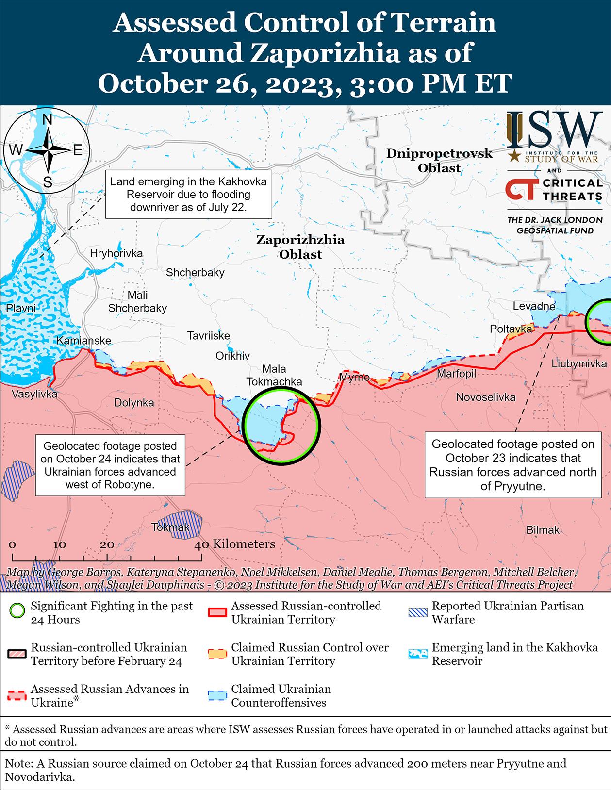 26 октября украинские силы продолжили наступательные действия на западе Запорожской области, но не подтвердили и не заявили о продвижении вперед. Российские источники, в том числе Министерство обороны России, заявили, что российские войска отразили украинские атаки в районах населенных пунктов Роботино (12 км к югу от Орехова) и Вербовое (9 км к востоку от Роботино). [67] Российские военные блогеры утверждали, что из-за плохой погоды украинские войска замедлили темпы наступательных операций на западе Запорожской области, а из-за плохой видимости ни украинская, ни российская артиллерия не ведут активный огонь. [68]