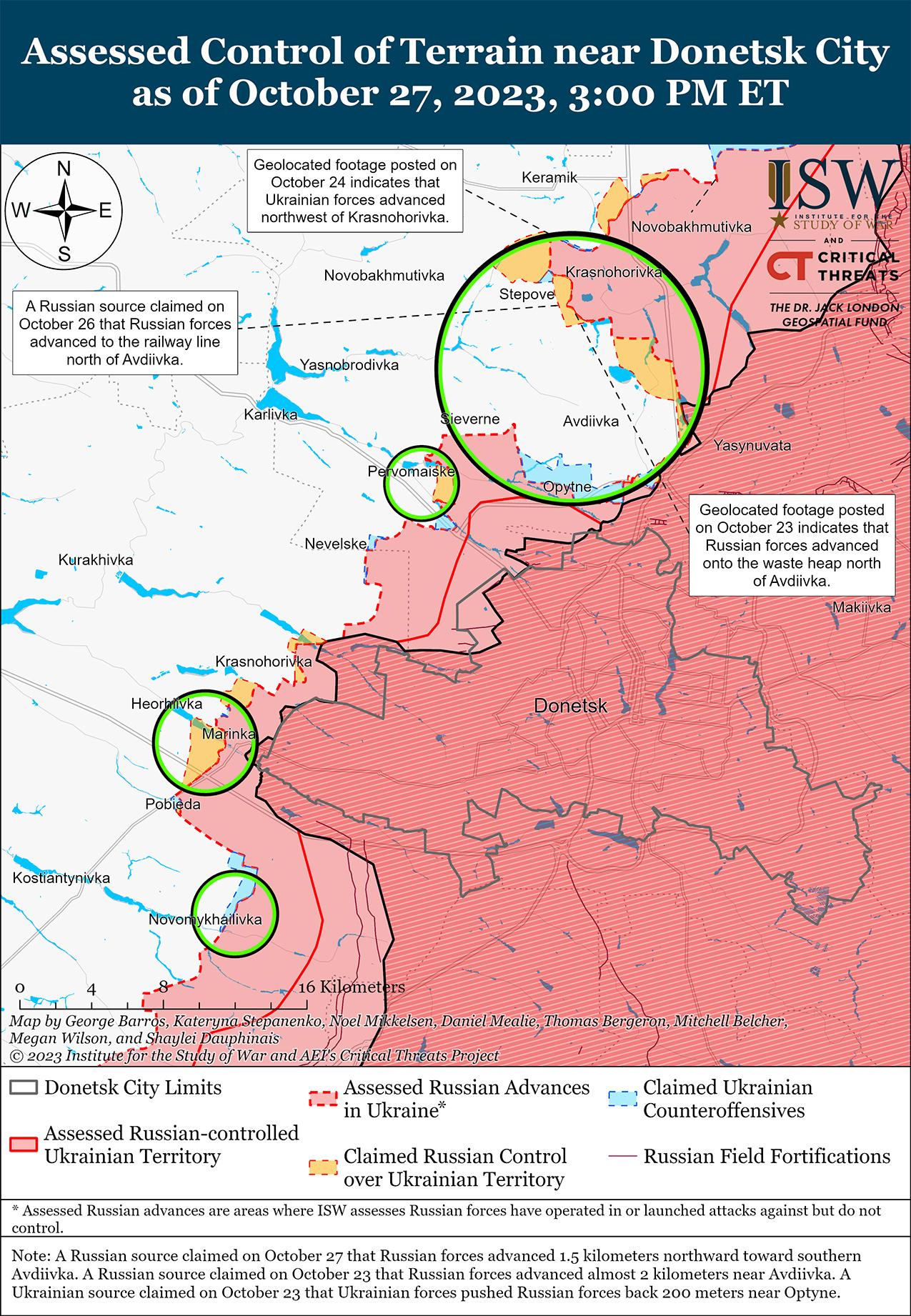 27 октября враг продолжил наступательные действия в районе Авдеевки, но не добился подтвержденных успехов. Генеральный штаб Вооруженных сил Украины сообщил, что украинские силы отразили более 20 российских атак вблизи населенных пунктов Степное (3 км к северу от Авдеевки), Авдеевка, Северное (6 км к западу от Авдеевки), Тоненькое (5 км к западу от Авдеевки) и Первомайское (11 км к юго-западу от Авдеевки). [35] 26 и 27 октября российские военные блогеры утверждали, что российские войска продвинулись на север от Опытное (4 км к югу от Авдеевки) и установили контроль над позициями в 1,5 км к юго-западу от Авдеевки в районе трассы Т0505 (Спартак-Авдеевка), хотя ISW не обнаружил визуальных подтверждений этих заявлений. [36] 26 и 27 октября российские военблогеры утверждали, что российские войска обошли украинские укрепленные позиции в районе ресторана «Царская охота» на южной окраине Авдеевки. [37] 26 и 27 октября российские военные заявляли, что российские войска продвинулись ближе к Авдеевскому коксохимическому заводу и закрепили контроль над позициями на Авдеевском терриконе к северу от Авдеевки. [38] 26 и 27 октября российские источники утверждали, что российские войска продолжали наступление в районе железнодорожной линии к северу от Авдеевки и в направлении Степного, хотя ISW не видел визуальных подтверждений этих заявлений. [39] 27 октября украинский военный наблюдатель заявил, что российские войска захватили Авдеевский террикон и продвинулись в районе железнодорожного полотна к северу от Авдеевки. [40] Украинский военный обозреватель констатировал, что российские войска добиваются неопределенных успехов на направлении Водяное – Тоненькое (7 км к юго-западу от 5 км к западу от Авдеевки), а 26 октября российский военный блогер заявил, что российские войска продвинулись от Водяного к окраинам Первомайского. [41] Украинский военный обозреватель утверждал, что командование 8-й общевойсковой армии РФ (Южный военный округ) изменило тактику в районе Авдеевки и теперь инструктирует тактические группы на северном и южном флангах Авдеевки о поочередных штурмах. [42] Российские войска ведут регулярные наступления к северу и югу от Авдеевки, но добились лишь незначительных успехов на северном фланге Авдеевки и лишь незначительных успехов на южном фланге после начала более масштабных наступательных действий 10 октября.