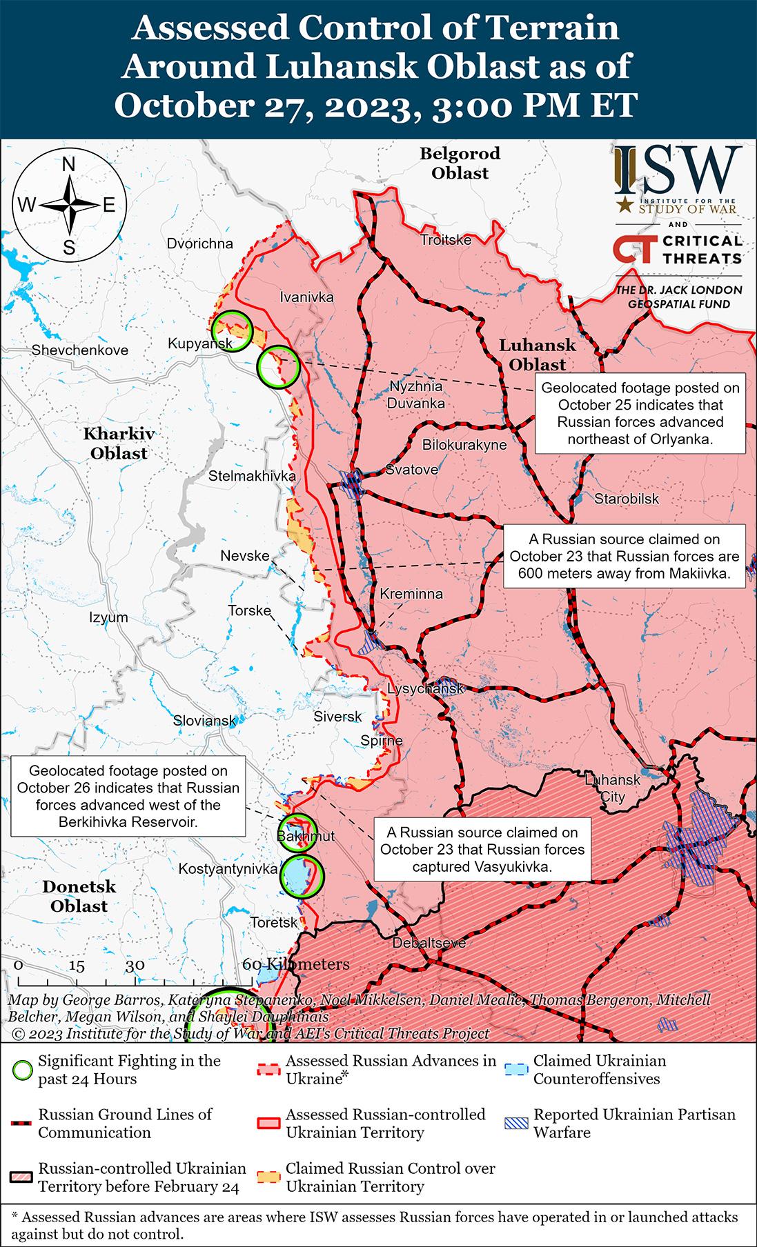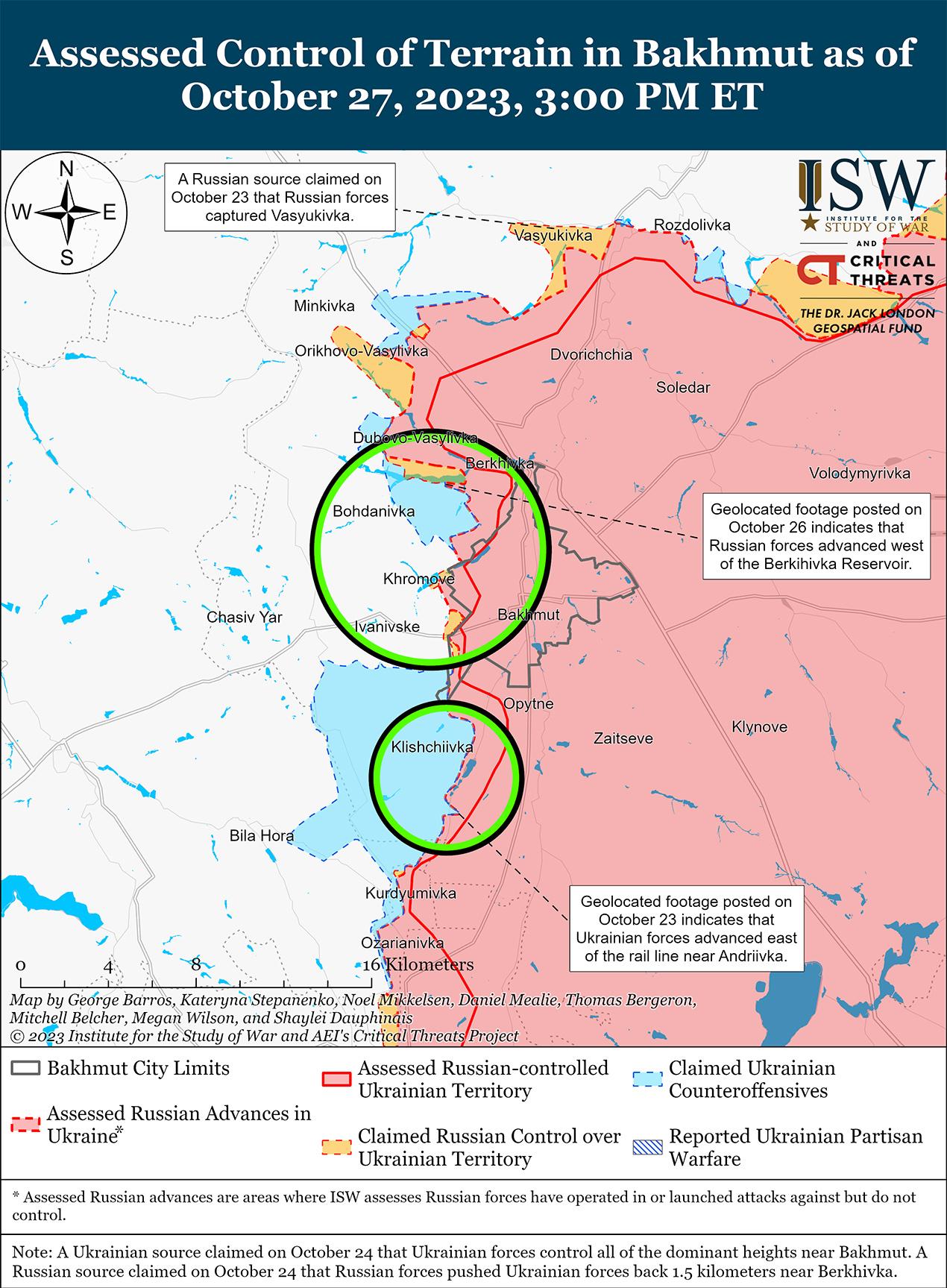 27 октября враг продолжил ограниченные наступательные действия в районе Бахмута и добился подтвержденных успехов. На геолоцированных кадрах, опубликованных 26 октября, видно, что российские войска продвинулись к югу от Берховского водохранилища (6 км к северу от Бахмута). [29] На дополнительных геолокационных кадрах, опубликованных 27 октября, видно, что российские войска добились незначительных успехов к западу от Курдюмовка (13 км к юго-западу от Бахмута). [30] Генеральный штаб Вооруженных сил Украины сообщил, что украинские силы отразили пять российских атак в районе Богдановки и Хромова (непосредственно к западу от Бахмута) и более 10 российских атак в районе Клещеевки и Андреевки (10 км к юго-западу от Бахмута). [31] 27 октября Фитё заявил, что за прошедшие сутки произошло 20 боевых столкновений. [32] Российский блогер утверждал, что российские войска атаковали в районе Дубово-Васильевка (6 км к северо-западу от Бахмута), и описывал, что российские войска пытаются перехватить инициативу на бахмутском направлении. [33] Российский медиаагрегатор утверждал, что 26 октября российские войска продвинулись на высотах к северо-востоку от Хромова и отбили позиции у железнодорожной ветки к востоку от Клещеевки. [34]