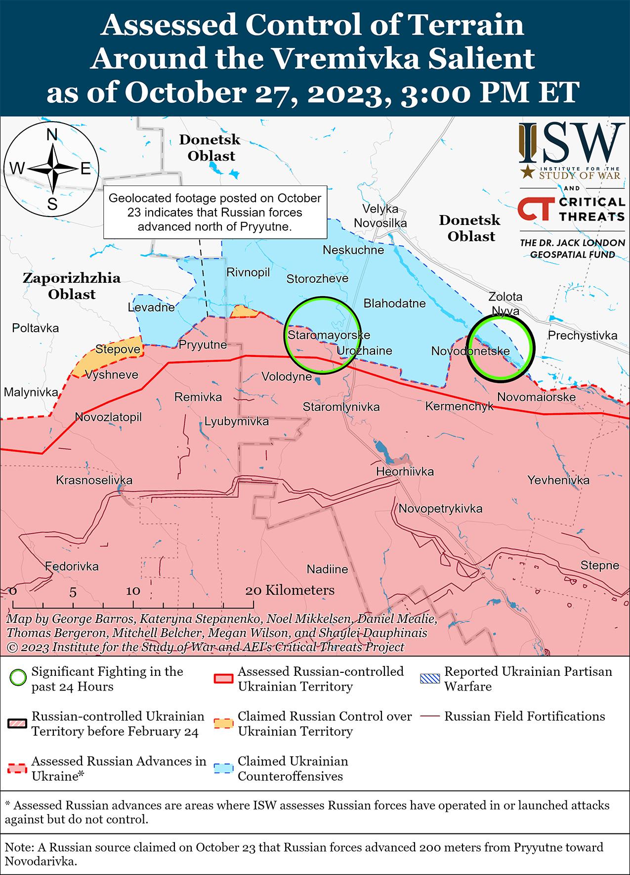 Российские войска продолжили наступательные действия на западной части границы Донецкой-Запорожской областей, но по состоянию на 27 октября не предприняли никаких заявленных или подтвержденных успехов. Генеральный штаб Вооруженных сил Украины сообщил, что российские войска безуспешно атаковали вблизи Старомайорское (9 км южнее Великая Новоселка) и Золотая Нива (11 км к юго-востоку от Великая Новоселка). [55] Российский военный блогер утверждал, что российские войска безуспешно контратаковали в направлении Старомайорского и Новодонецкого (12 км к юго-востоку от Великой Новоселки). [56] Другой российский блогер утверждал, что подразделения российского 394-го мотострелкового полка (127-я мотострелковая дивизия, 5-я общевойсковая армия, Восточный военный округ) консолидируют контроль над недавно захваченными позициями к северо-востоку от Приютного (16 км к юго-западу от Великой Новоселки), хотя ISW не обнаружил визуальных свидетельств недавних российских продвижений в этом районе. [57] Министерство обороны России заявило, что за прошедшую неделю российские войска улучшили свои позиции на южнодонецком направлении (западная часть Донецкой области и приграничный район Донецкой-Запорожской областей). [58]