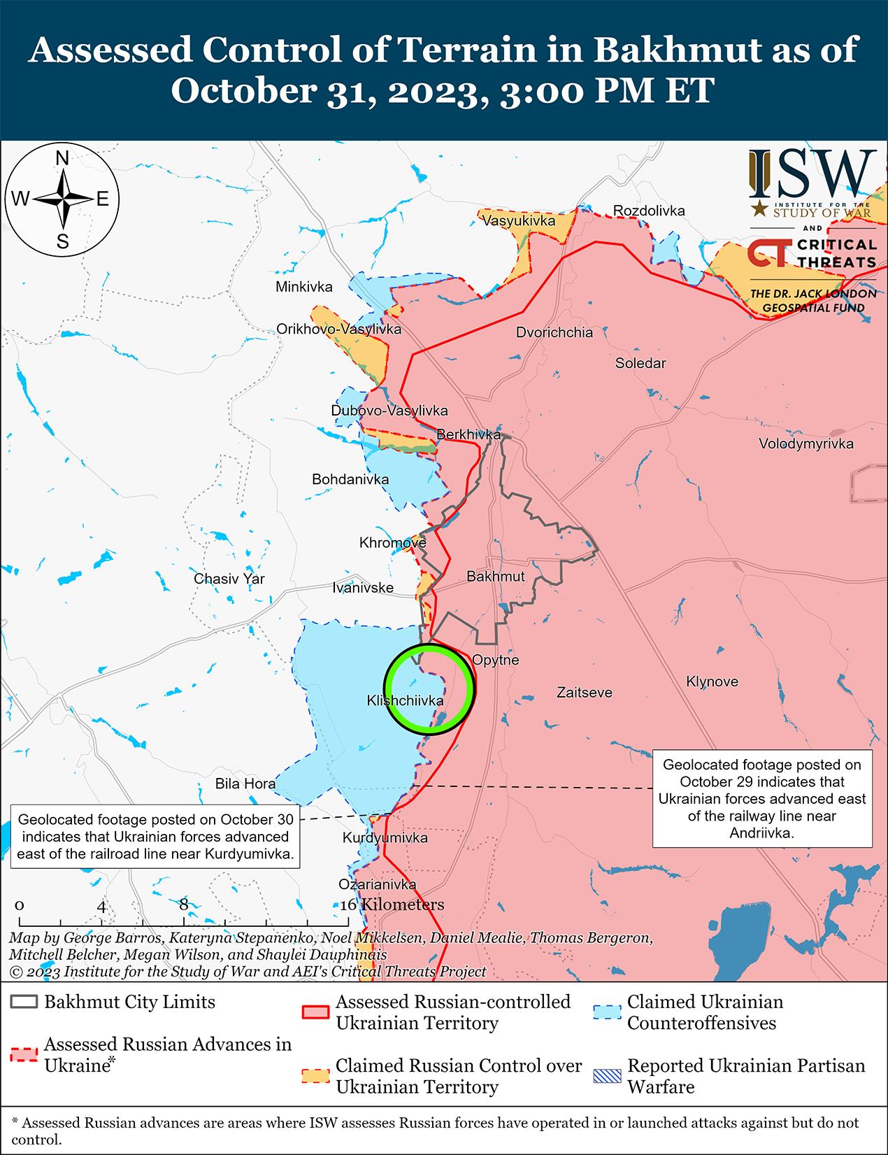 Украинские войска продолжили наступательные действия в районе Бахмута, но по состоянию на 31 октября не добились каких-либо подтвержденных успехов. Украинский Генштаб сообщил, что украинские силы продолжают наступательные действия южнее Бахмута. [19] Российские военные блогеры утверждали, что российские войска отразили украинские атаки вблизи Клещеевки (7 км к юго-западу от Бахмута), Андреевки (10 км к юго-западу от Бахмута) и Курдюмовки (13 км к юго-западу от Бахмута). [20] Российский блогер утверждал, что украинские силы консолидировали контроль над позициями к востоку от железнодорожной линии в районе Андреевки и незначительно продвинулись к югу от населенного пункта. [21]