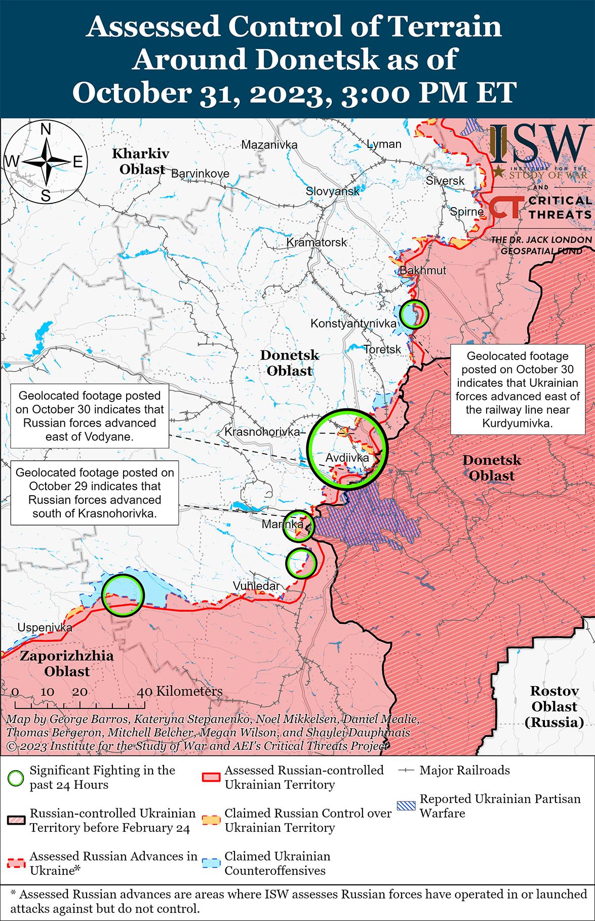 31 октября российские источники продолжили наступательные действия в районе Авдеевки и добились подтвержденных успехов. Геолоцированные кадры, опубликованные 30 октября, показывают, что российские войска незначительно продвинулись к юго-западу от Авдеевки. [27] На дополнительных геолокационных кадрах, опубликованных 30 октября, видно, что российские войска продвинулись к юго-западу от Красногоровки (5 км к северу от Авдеевки). [28] 30 и 31 октября российские военные блогеры утверждали, что российские войска продвигаются в районе Авдеевского коксохимического завода к северу от Авдеевки. [29] 31 октября российский военный блогер заявил, что российские войска не ведут активных атак на коксохимический завод и все еще готовятся к наземному штурму. [30] Другой российский блогер утверждал, что российские войска продвинулись к окраинам Авдеевской промзоны. [31] Российские военные блогеры утверждали, что российские войска также продвигаются вблизи Красногоровки, Тоненького (5 км к западу от Авдеевки), Северного (6 км к западу от Авдеевки), Водяного (7 км к юго-западу от Авдеевки) и Первомайского (11 км к юго-западу от Авдеевки). [32] Один из российских источников 29 октября раскритиковал другие источники за то, что они писали «победоносные» репортажи о продолжающейся операции и превентивно утверждали, что российские войска захватили определенные позиции, предполагая, что некоторые российские корреспонденты до сих пор негативно воспринимают тактическую обстановку под Авдеевкой. [33] 31 октября Генштаб Вооруженных сил Украины сообщил, что враг безуспешно атаковал вблизи Керамик (10 км северо-западнее Авдеевка), Степовое (3 км северо-западнее Авдеевка), Тоненькое, Северное и Первомайское. [34]
