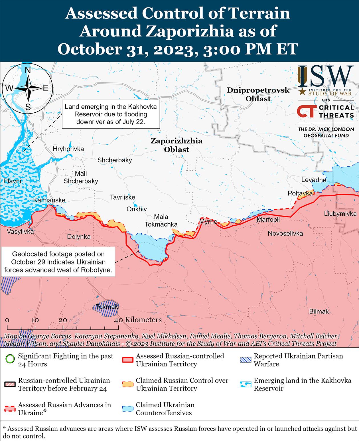 31 октября российские войска перешли в контрнаступление на западе Запорожской области, но не добились каких-либо подтвержденных успехов. В украинском Генштабе сообщили, что российские войска безуспешно пытались восстановить утраченные позиции в районе Роботино. [42] Источник, связанный с БАРС-13, утверждал, что российские войска контратаковали и оттеснили украинские войска с позиций в районе Вербового. [43] Российские источники утверждали, что российские войска провели успешную контратаку из Вербово в направлении Роботино. [44] ISW не обнаружил визуальных подтверждений этих заявленных российских успехов.