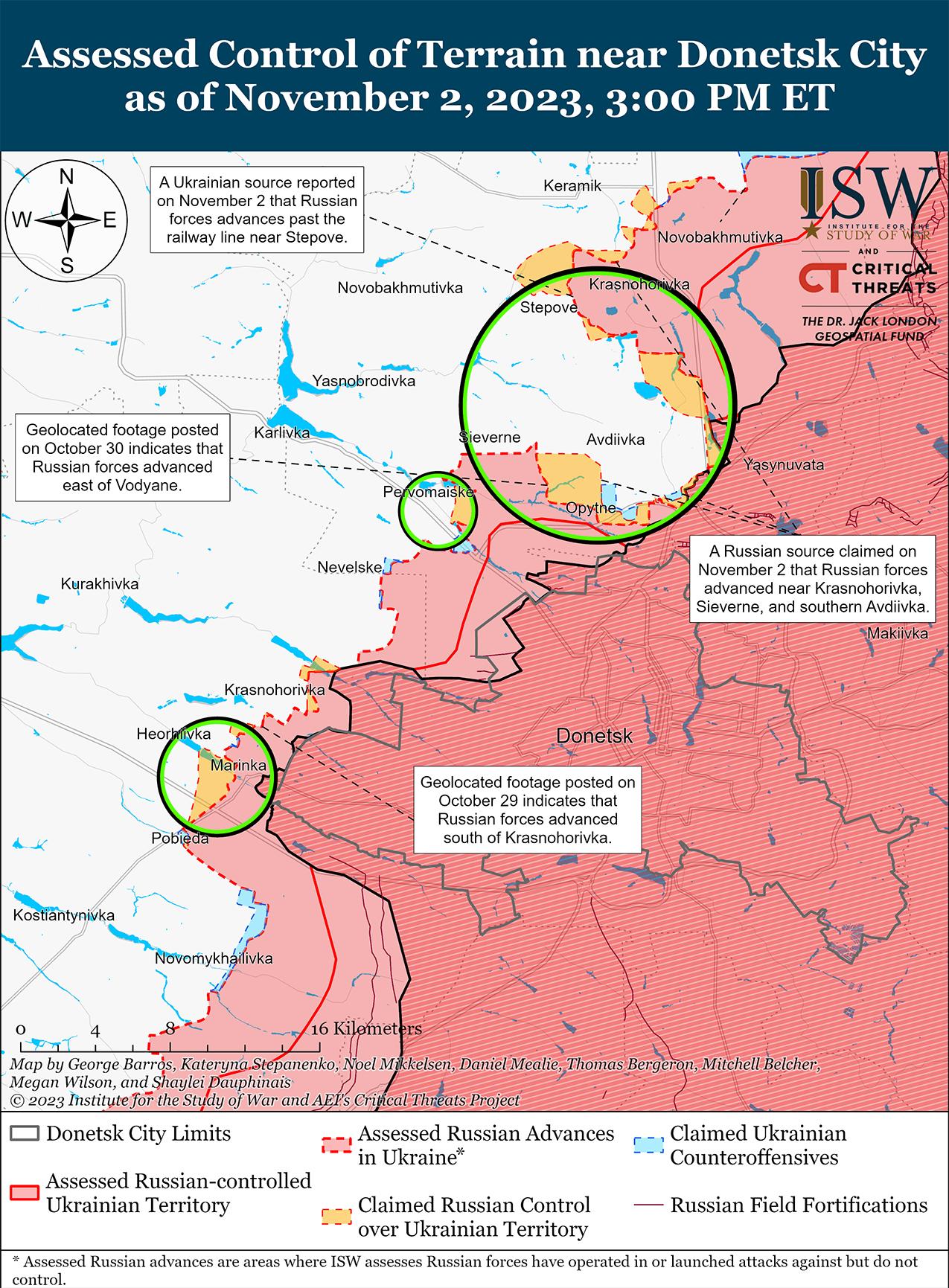 2 ноября враг продолжил наступательные действия в районе Авдеевки, но подтвержденных успехов не добился. Генеральный штаб Вооруженных сил Украины сообщил, что украинские силы продолжают сдерживать наступление россиян в районе Авдеевки и отразили российские атаки в районах населенных пунктов Северное (6 км к западу от Авдеевки), Тоненькое (8 км к западу от Авдеевки) и Первомайское (11 км к юго-западу от Авдеевки). [49] Спикер Таврийской группировки войск Украины полковник Александр Штупун заявил, что российские войска атакуют в основном небольшими группами пехоты. [50] Штупун заявил, что темпы российских операций под Авдеевкой снижаются из-за того, что российские войска перегруппировываются и нуждаются в подкреплении. [51] Глава Авдеевской городской военной администрации Виталий Барабаш заявил, что российские войска сосредотачивают усилия на северном фланге Авдеевки и ведут последовательные штурмовые действия, несмотря на сильные дожди в этом районе. [52] Украинский военный наблюдатель заявил, что российские войска пересекли железнодорожную линию в районе Степовое (3 км к северу от Авдеевки) и готовятся к обстрелу с этих недавно захваченных позиций Авдеевского коксохимического завода на севере Авдеевки. [53] Российский медиаагрегатор утверждал, что 1 ноября российские войска подошли к Авдеевскому коксохимическому заводу. [54] Российский блогер утверждал, что 1 ноября российские войска нанесли комбинированные ракетные и авиационные удары по Авдеевскому коксохимическому заводу, но отметил, что украинская противовоздушная оборона не позволяет российским войскам нанести массированный удар по этому району. [55] Украинский военный обозреватель также констатировал, что российские войска расширяют контроль над позициями в районе Опытное (4 км южнее Авдеевки). [56] Известный российский блогер утверждал, что российские войска продвинулись ближе к юго-западным окраинам Авдеевки и до километра от Северного, хотя ISW не обнаружил визуальных подтверждений этих заявлений. [57]