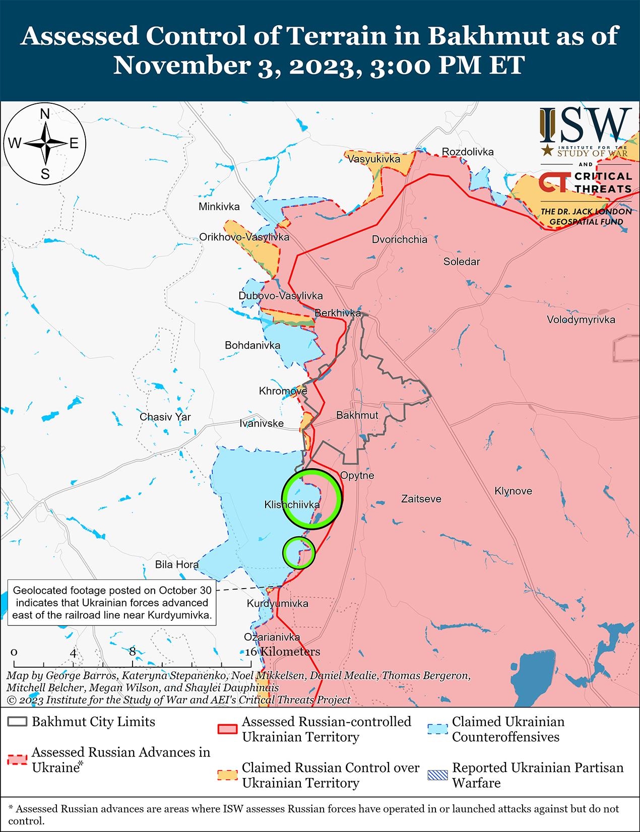 3 ноября российские войска продолжили ограниченные наступательные действия в районе Бахмута, но не добились каких-либо подтвержденных или заявленных успехов. Генеральный штаб Вооруженных сил Украины сообщил, что украинские силы отбили более 10 российских атак вблизи Богдановка (7 км к северо-западу от Бахмута), Хромово (непосредственно к западу от Бахмута), Клещеевка, Андреевка (10 км к юго-западу от Бахмута) и Южное (21 км к юго-западу от Бахмута). [38]