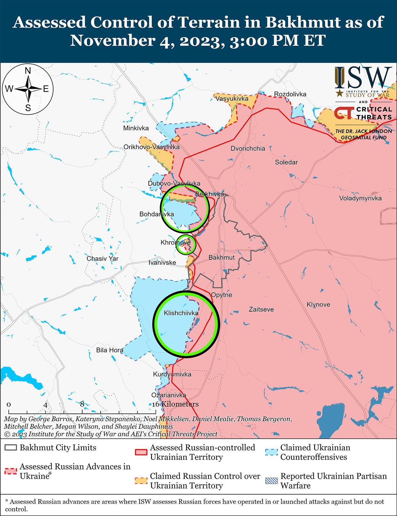 4 ноября украинские силы продолжили наступательные действия вблизи Бахмута и на западе Запорожской области. В украинском Генштабе сообщили, что украинские силы продолжили наступательные действия на Мелитопольском (западная Запорожская область) и Бахмутском направлениях. [13] Российские военные блогеры утверждали, что украинские силы продвинулись вдоль посадки леса к северу от Клещеевка (7 км к юго-западу от Бахмута) и закрепляются в этом районе. [14]