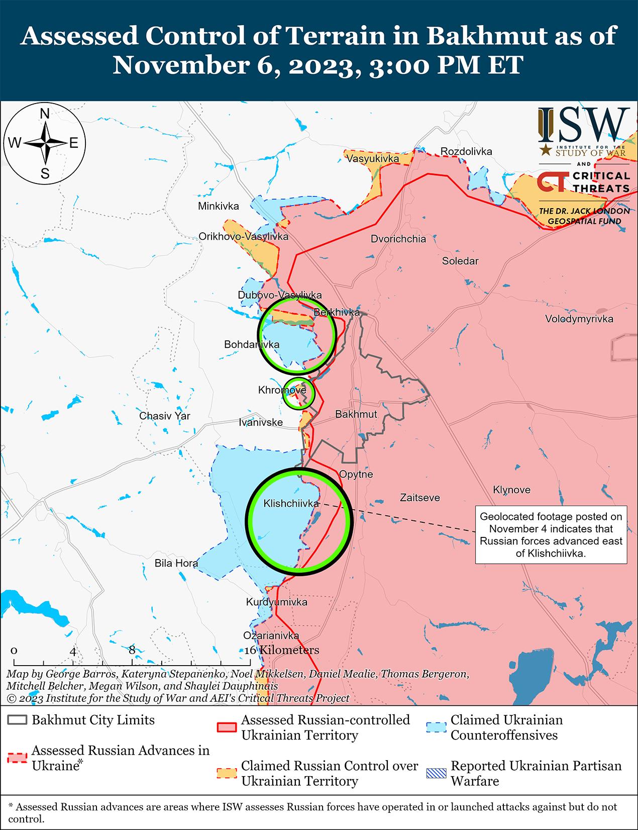 6 ноября враг продолжил наступательные действия на Бахмутском направлении и добился подтвержденных успехов. На геолоцированных кадрах, опубликованных 6 ноября, видно, что российские войска незначительно продвинулись на север вдоль дороги в районе Васюковки (примерно в 12 км к северу от Бахмута). [51] Украинский источник и несколько российских блогеров также утверждали, что российские войска добились успехов в районе Берховского водохранилища (непосредственно к северо-западу от Бахмута), при этом некоторые источники утверждали, что российские войска контролируют все водохранилище, а некоторые утверждали, что контролируют только южный берег. [52] ISW пока не обнаружил визуальных подтверждений предполагаемых успехов России в районе Берховки. Российские источники, как сообщается, подтвердили кадры, на которых видно, как подразделения российской 58-й бригады специального назначения (бывшая 3-я бригада спецназа Донецкой Народной Республики [ДНР]) сражаются под Бахмутом. [53] Источник, связанный с российским БАРСом, утверждал, что российские войска успешно оттесняют украинские войска от позиций между Клещеевкой и Андреевкой. [54] Генштаб Вооруженных сил Украины сообщал, что российские войска безуспешно пытались вернуть утраченные позиции в районах населенных пунктов Клещеевка (7 км к юго-западу от Бахмута) и Андреевка (10 км к юго-западу от Бахмута), а также атаковали в районах населенных пунктов Богдановка (7 км к западу от Бахмута), Хромово (непосредственно к западу от Бахмута) и Южное (21 км к юго-западу от Бахмута), но не продвинулись вперед. [55]