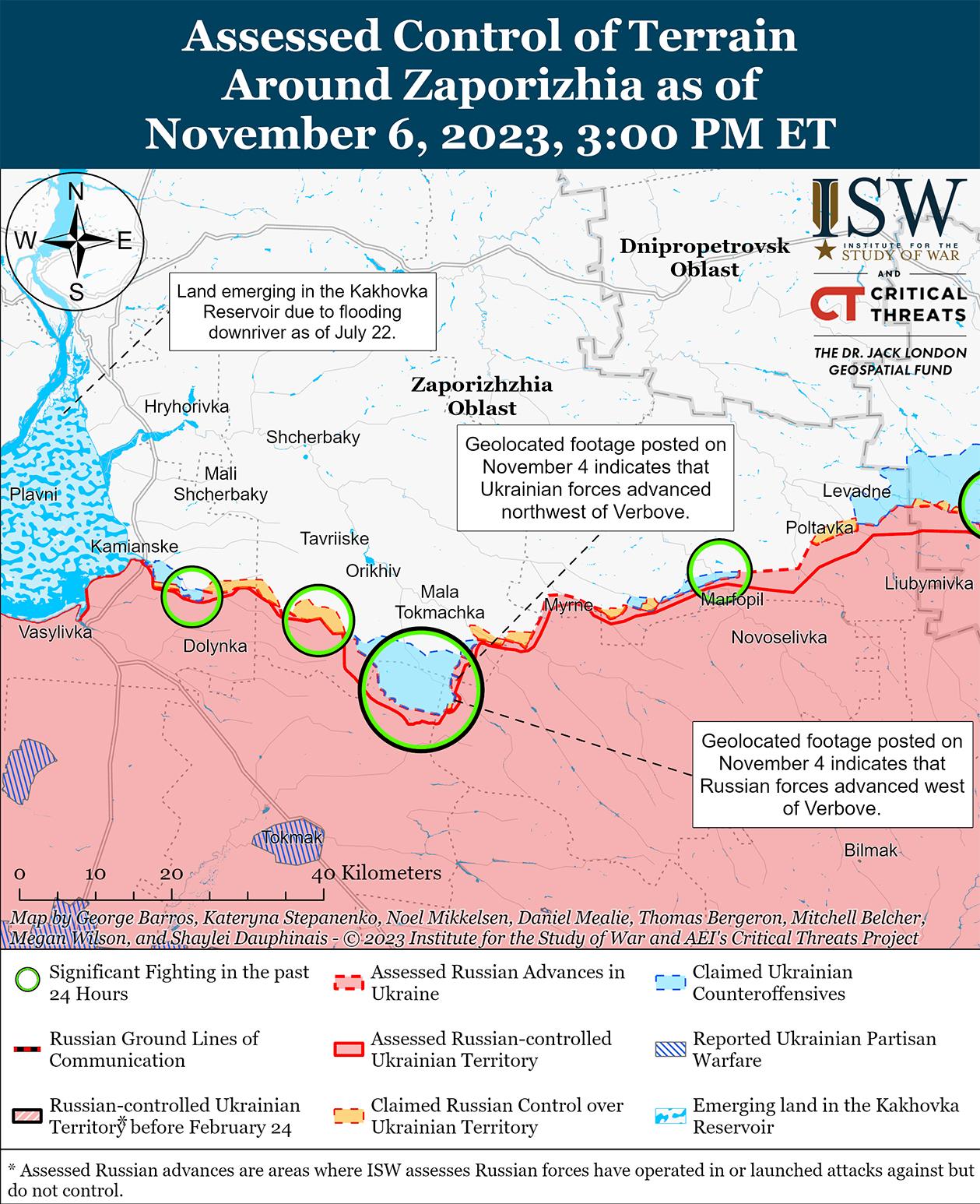 Российские источники утверждали, что 6 ноября российские войска добились постепенных территориальных завоеваний в западной части Запорожской области, но ISW не обнаружил визуальных подтверждений этих заявлений. Российский военный блогер заявил, что российские войска отразили украинскую атаку в районе Роботино и захватили две неназванные украинские позиции после контратаки в этом районе. [87] Связанный с Кремлем военный блогер утверждал, что российские войска атаковали в районе Роботино и пытались продвинуться со стороны Вербового. [88] По оценке украинского военного обозревателя Константина Машовца, неназванные части 42-й гвардейской мотострелковой дивизии (58-я общевойсковая армия, Южный военный округ) решили «проявить себя» серией неудачных атак южнее Роботино после того, как российское командование провело ротацию других частей 42-й дивизии и подчинило их 136-й мотострелковой бригаде (58-я общевойсковая армия). [89]