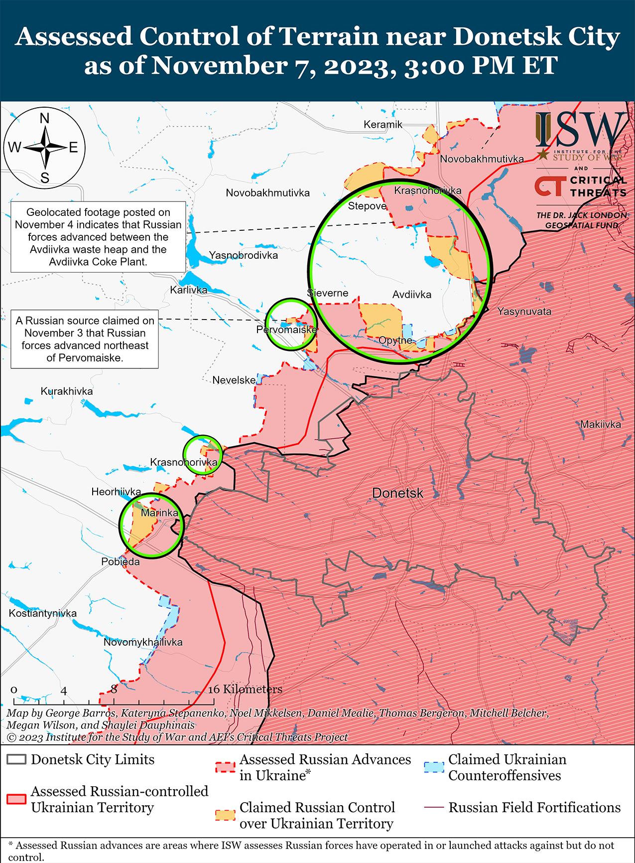 7 ноября российские войска вели наступательные действия вблизи Авдеевки и, как сообщается, продвинулись вперед. Российские источники утверждали 6 и 7 ноября, что российские войска незначительно продвинулись вдоль железнодорожной линии в районе Степное (3 км к северо-западу от Авдеевки). [39] 7 ноября российские военные блогеры утверждали, что российские войска продвинулись в районе Северного (6 км к западу от Авдеевки), но не вошли в сам населенный пункт. [40] Военблогеры также утверждали, что российские войска продвинулись вдоль реки от Водяного в направлении Первомайское (10 км к юго-западу от Авдеевки) и что российские войска контролируют террикон к северу от Авдеевки, но украинская артиллерия не позволяет российским войскам закрепиться там. [41] Российские источники утверждали, что 6 и 7 ноября российские войска наступали в районе Первомайского и Степного, севернее Спартака (4 км южнее Авдеевки), в направлении Северного, а также на южных и восточных подступах к Авдеевке. [42] Генштаб Вооруженных сил Украины сообщил, что российские войска безуспешно атаковали вблизи населенных пунктов Степное, Авдеевка, Тоненькое (5 км западнее Авдеевки) и Первомайское. [43] Российский блогер заявил, что российские войска перешли к «ползучему наступлению» на Авдеевском направлении после того, как российские войска провели «мощный натиск» в первые дни атак, что говорит о замедлении темпов российских наступательных действий на этом направлении. [44] Другой российский блогер заявил, что российские войска страдают от нехватки комплексов радиоэлектронной борьбы (РЭБ) на Авдеевском направлении, что позволяет украинским силам установить контроль в воздухе в этом районе. [45]