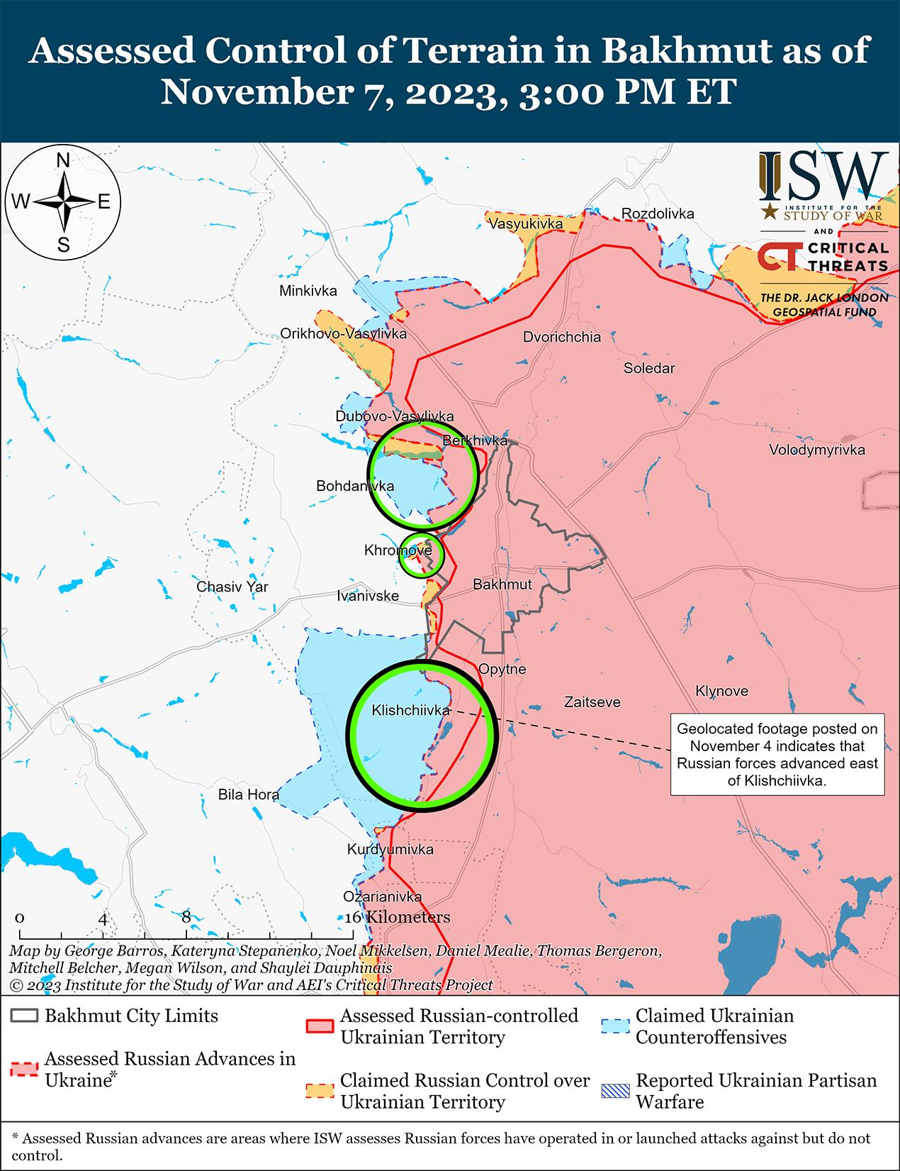 Враг вел наступательные действия вблизи Бахмута, но 7 ноября не добился подтвержденных успехов. Российский блогер заявил, что российские войска незначительно продвинулись в районе Клещеевки и «значительно» продвинулись от Берховки (6 км к северо-западу от Бахмута) до Богдановки (6 км к северо-западу от Бахмута). [34] Другой российский блогер утверждал 6 и 7 ноября, что российские войска вернули утраченные позиции в направлении Зеленополья (4 км к северо-востоку от Бахмута) и продвинулись к Васюковке и Сакко-и-Ванцетти (оба в 16 км к северу от Бахмута) и в районе Клещеевки. [35] ISW не обнаружил визуальных подтверждений этих заявленных российских успехов. 6 ноября российский военный блогер заявил, что российские войска контратаковали к северу от Клещеевки и к югу от Андреевки, а российский новостной агрегатор заявил, что 6 ноября российские войска оттеснили украинские войска с участка железнодорожной линии между Клещеевкой и Андреевкой. [36] 7 ноября украинский Генштаб сообщил, что российские войска безуспешно атаковали вблизи Богдановки, Хромова (непосредственно к западу от Бахмута), Андреевки и Клещеевки. [37] Минобороны России сообщило, что к северу от Бахмута действуют подразделения 98-й гвардейской воздушно-десантной дивизии (ВДВ). [38]