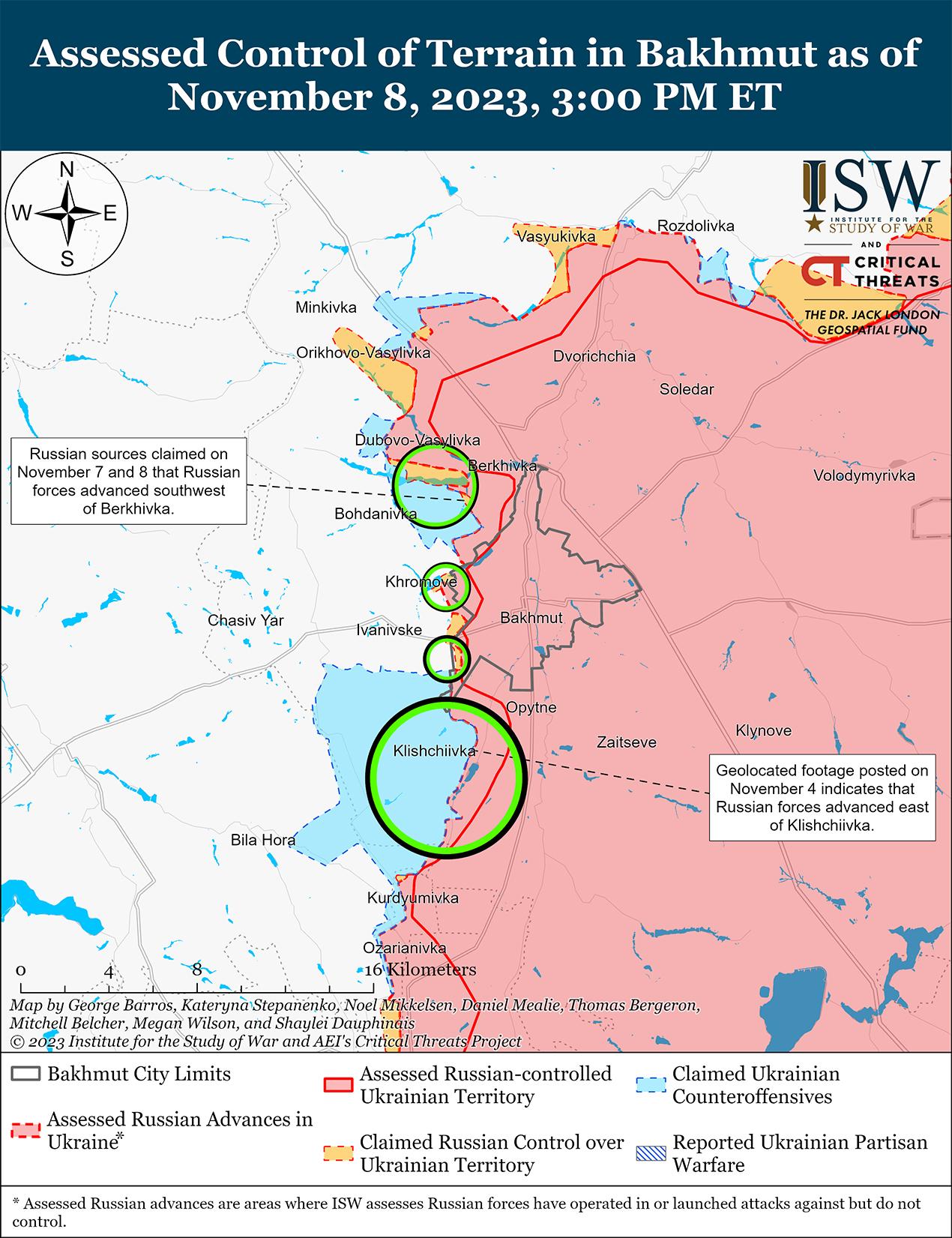 Российские войска продолжили наступательные действия в районе Бахмута и, как сообщается, продвинулись 8 ноября. Российские военные блогеры утверждали, что российские войска продвинулись незначительно от Берховка (6 км к северо-западу от Бахмута) в направлении Богдановка (6 км к северо-западу от Бахмута). [30] Один российский блогер утверждал, что российские войска также успешно контратаковали в районе Клещеевки (7 км к юго-западу от Бахмута), а другой блогер утверждал, что российские войска вновь вошли в населенный пункт. [31] Однако ISW не обнаружил визуальных доказательств этих утверждений. Генеральный штаб Вооруженных сил Украины сообщил, что украинские силы отразили атаки россиян в районах населенных пунктов Богдановка, Хромово (непосредственно к западу от Бахмута), Ивановское (6 км к западу от Бахмута), Клещеевка (7 км к юго-западу от Бахмута) и Андреевка (10 км к юго-западу от Бахмута). [32]