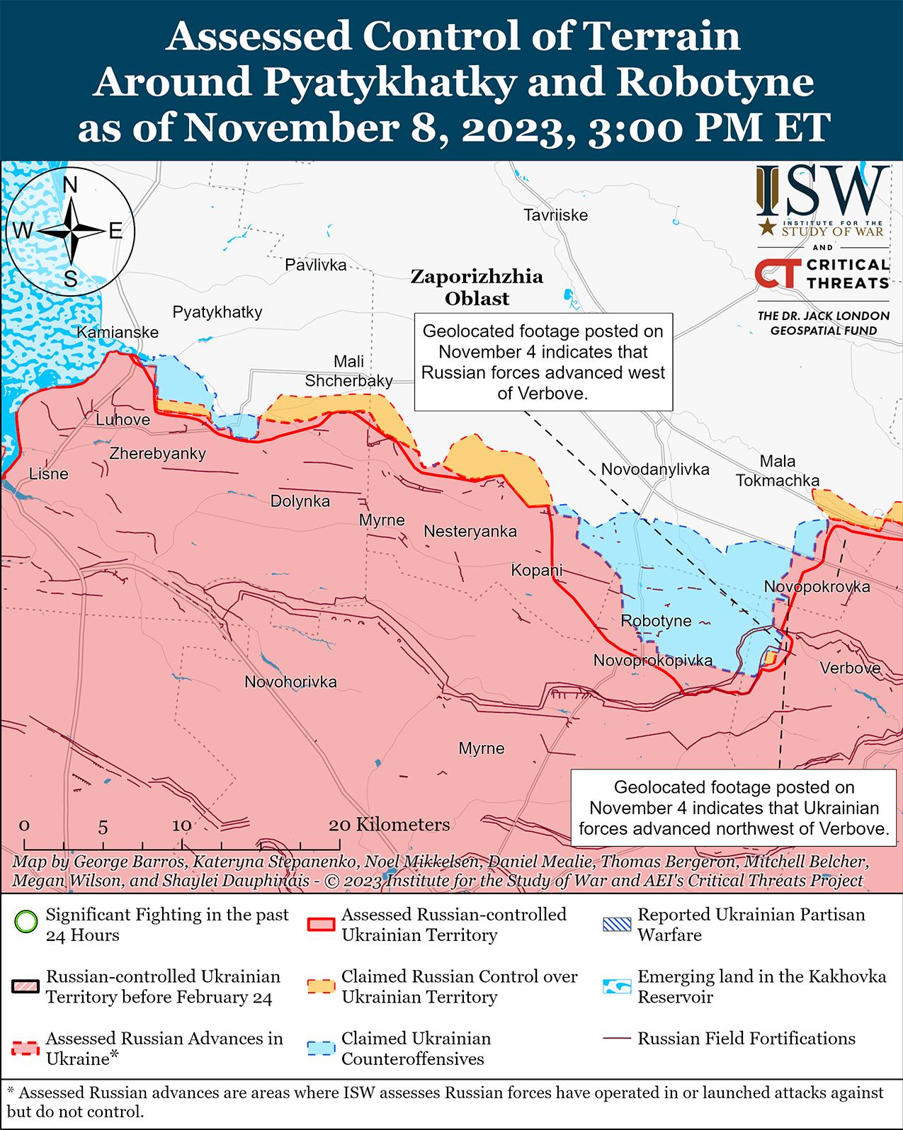 8 ноября украинские силы продолжили контрнаступательные действия вблизи Бахмута и на западе Запорожской области. В украинском Генштабе сообщили, что украинские силы продолжили наступательные действия на Мелитопольском (западная Запорожская область) и Бахмутском направлениях. [1] Российские источники утверждали, что украинские силы вели штурмовые действия вблизи населенных пунктов Роботино, Новопрокоповка (к югу от Роботино) и Вербовое (9 км к востоку от Роботино). [2] Президент Украины Владимир Зеленский заявил во время видеообращения к конференции Reuters NEXT в Нью-Йорке 8 ноября, что у украинских сил есть план боевых действий на 2024 год, который он не может раскрыть. [3] Зеленский заявил, что у украинских сил есть несколько путей для будущего продвижения на юге Украины, востоке Украины и в Херсонской области. Также планируется продвижение к конкретным оккупированным городам. [4] Украинские силы продолжают контрнаступательные операции без перерыва на нескольких участках фронта, и украинские официальные лица продолжают указывать, что эти операции будут продолжаться и этой зимой. [5]