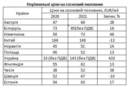 Вибору саме цієї моделі торгівлі, очевидно, сприяв і небувалий стрибок цін на північноамериканському лісовому ринку у травні 2021 р., коли ціни на будівельні пиломатеріали хвойних порід раптово злетіли на +465% до 740 USD/м3, що викликало ланцюгову реакцію підвищення цін на весь асортимент лісопродукції. Це торкнулося й українського ринку, особливо щодо підвищення цін на круглі лісоматеріали, що викликав ажіотажний попит не лише серед переробників, а й перекупників, що ще більше збільшувало попит. Якщо на західному ринку ціна на хвойний пиловник зросла в середньому на 125%, то на українському ринку на 433%. Це стало можливим завдяки різним моделям торгівлі круглим лісом: на західному ринку за прямими договорами, в Україні через аукціони для підвищення ціни.