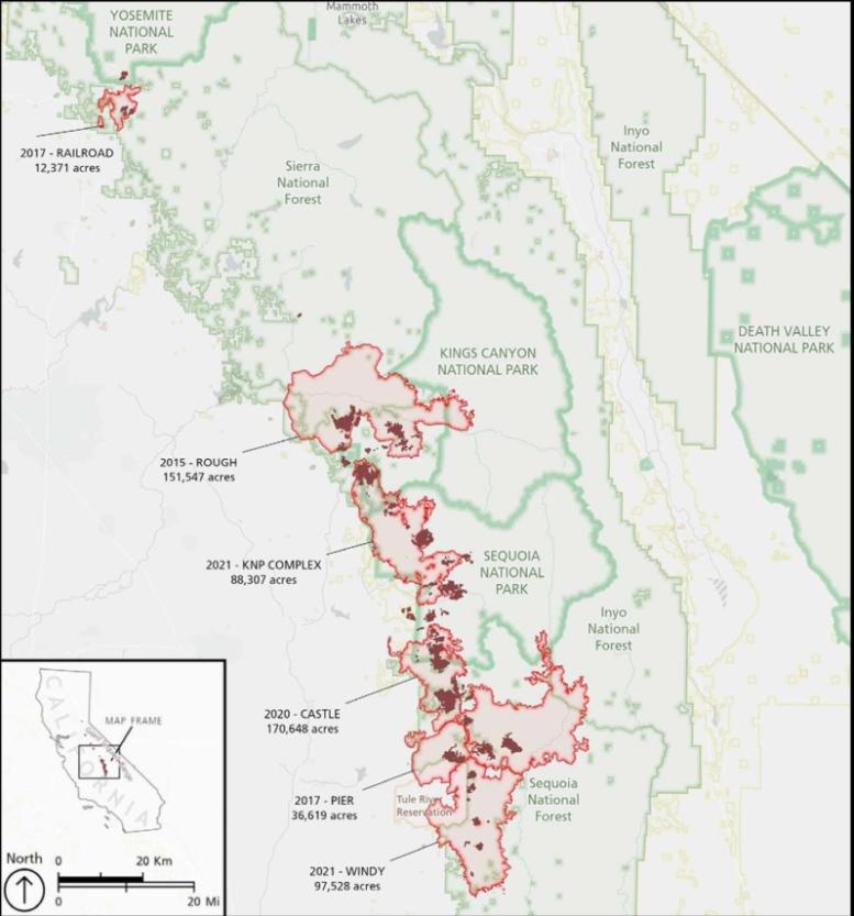 Места шести недавних лесных пожаров, поразивших гигантские секвойи. Рощи секвойи окрашены в темно-красный цвет. СЛУЖБА НАЦИОНАЛЬНЫХ ПАРКОВ / АДАПТИРОВАНО YALE ENVIRONMENT 360