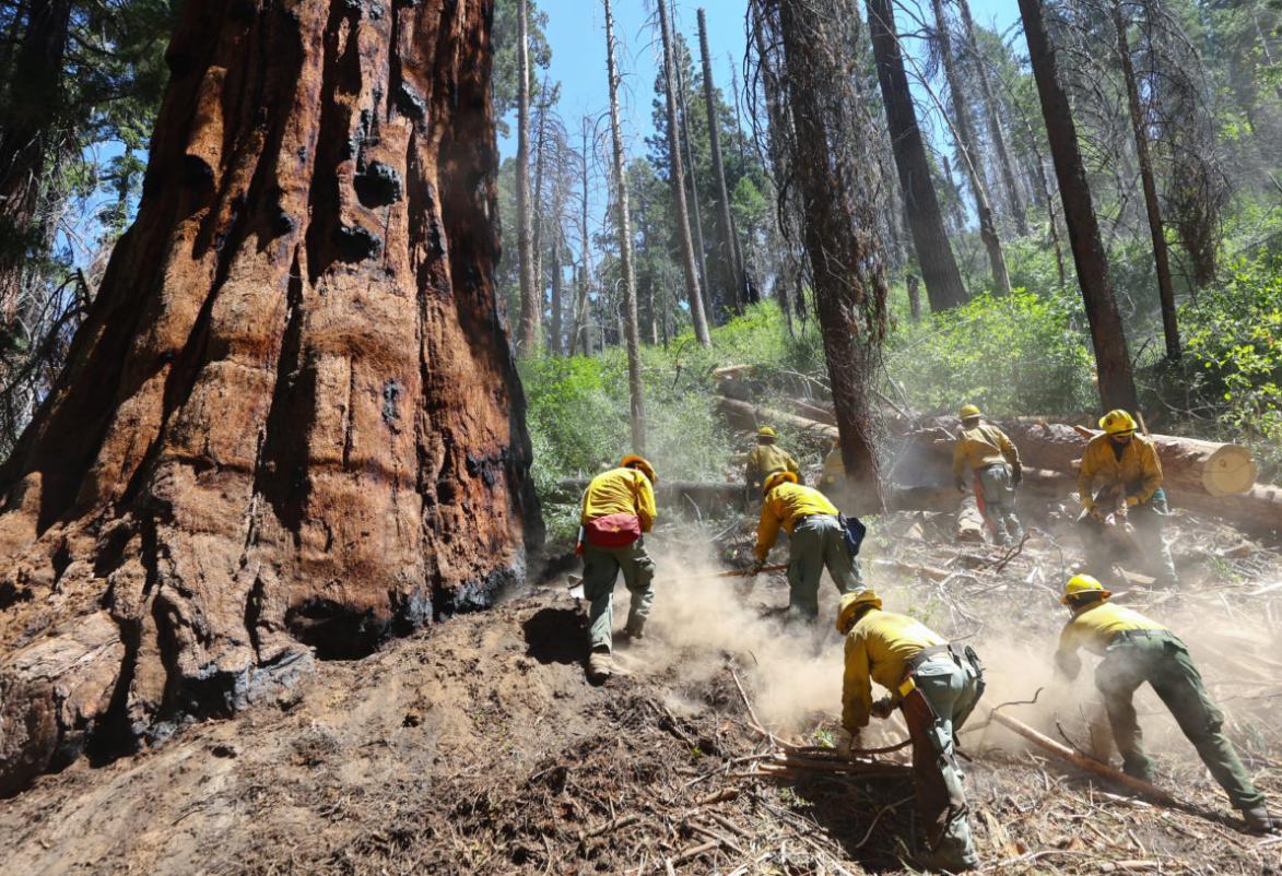 Пожарные расчищают сухую растительность под гигантским деревом в Национальном лесу Секвойя, чтобы предотвратить возгорание секвойи. МАРИО ТАМА / GETTY IMAGES