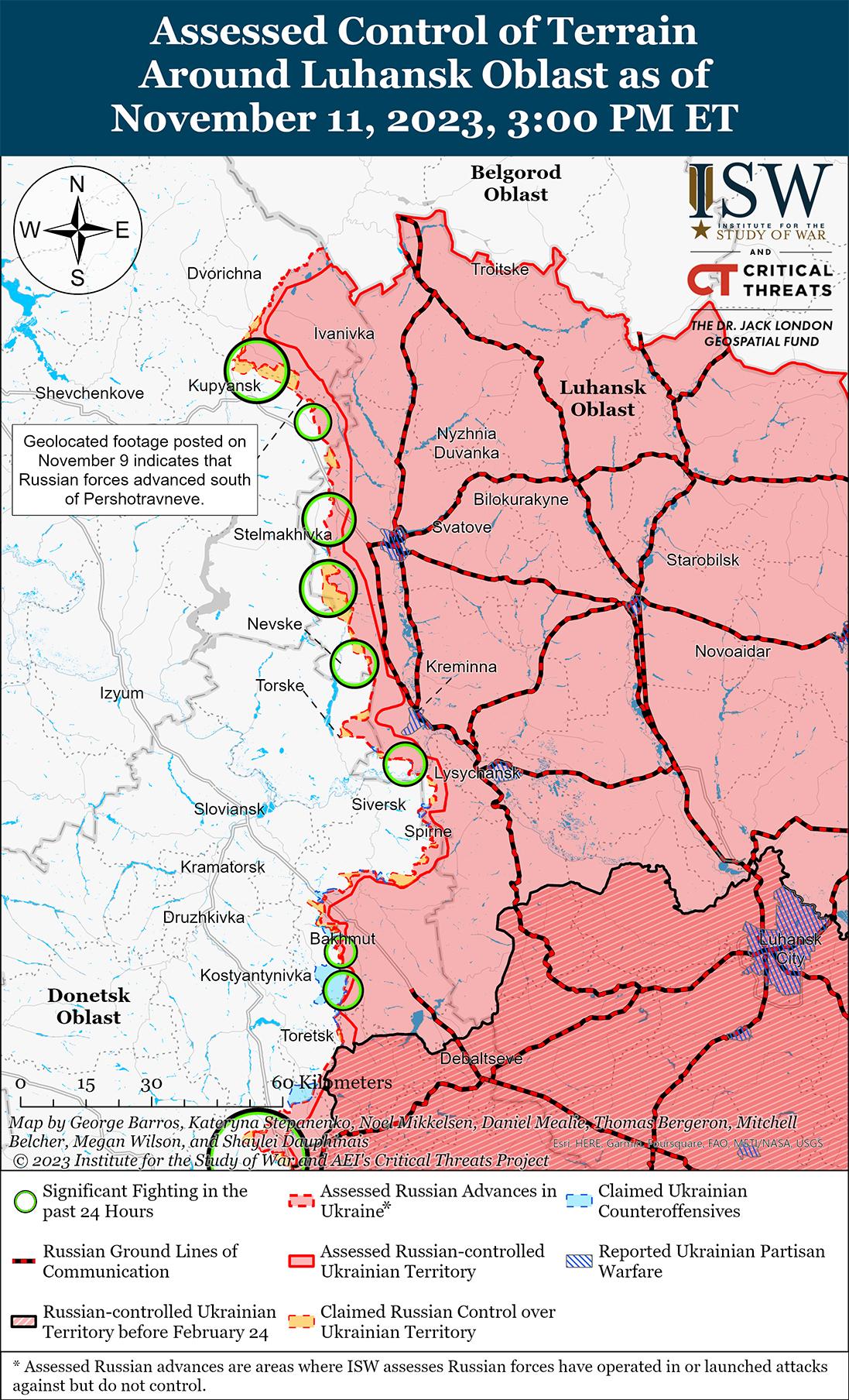 Российские войска недавно подтвердили продвижение в районе Авдеевки и временно активизировали наступательные действия в период с 10 по 11 ноября, вероятно, чтобы закрепить недавние успехи в этом районе. На геолоцированных кадрах, опубликованных 7 и 10 ноября, видно, что российские войска продвинулись в восточную часть Степного (3 км к северо-западу от Авдеевки), пересекли железнодорожную линию к юго-востоку от Степного и вошли в лесополосу к северу от Степного. [37] Российские источники в основном утверждали, что российские войска закрепились на восточной окраине Степного и продвинулись южнее Авдеевки в районе ресторана «Царская охота». [38] 10 ноября известный российский военный блогер заявил, что российские войска вошли в Степное, провели разведку боем, а затем отступили. [39] Генштаб Вооруженных сил Украины сообщил, что украинские войска отбили атаки противника к востоку от Новокалиново (11 км к северо-западу от Авдеевка); вблизи Степного, Авдеевки, Северного (6 км к западу от Авдеевки) и Первомайское (11 км к юго-западу от Авдеевки); и к югу от Тоненькое (5 км к западу от Авдеевка). [40] Спикер Генштаба и Таврийской группировки войск полковник Александр Штупун сообщил, что за последние сутки российские войска увеличили количество наземных атак в районе Авдеевки, однако Генштаб Украины сообщил в вечерней сводке от 11 ноября, что за сутки российские войска совершили только 14 атак. [41] Этот темп в большей степени соответствует количеству российских атак, зафиксированных на Авдеевском направлении за последнюю неделю, что указывает на то, что увеличение числа российских атак в период с 10 по 11 ноября, вероятно, закрепит успехи в районе Степного. [42]