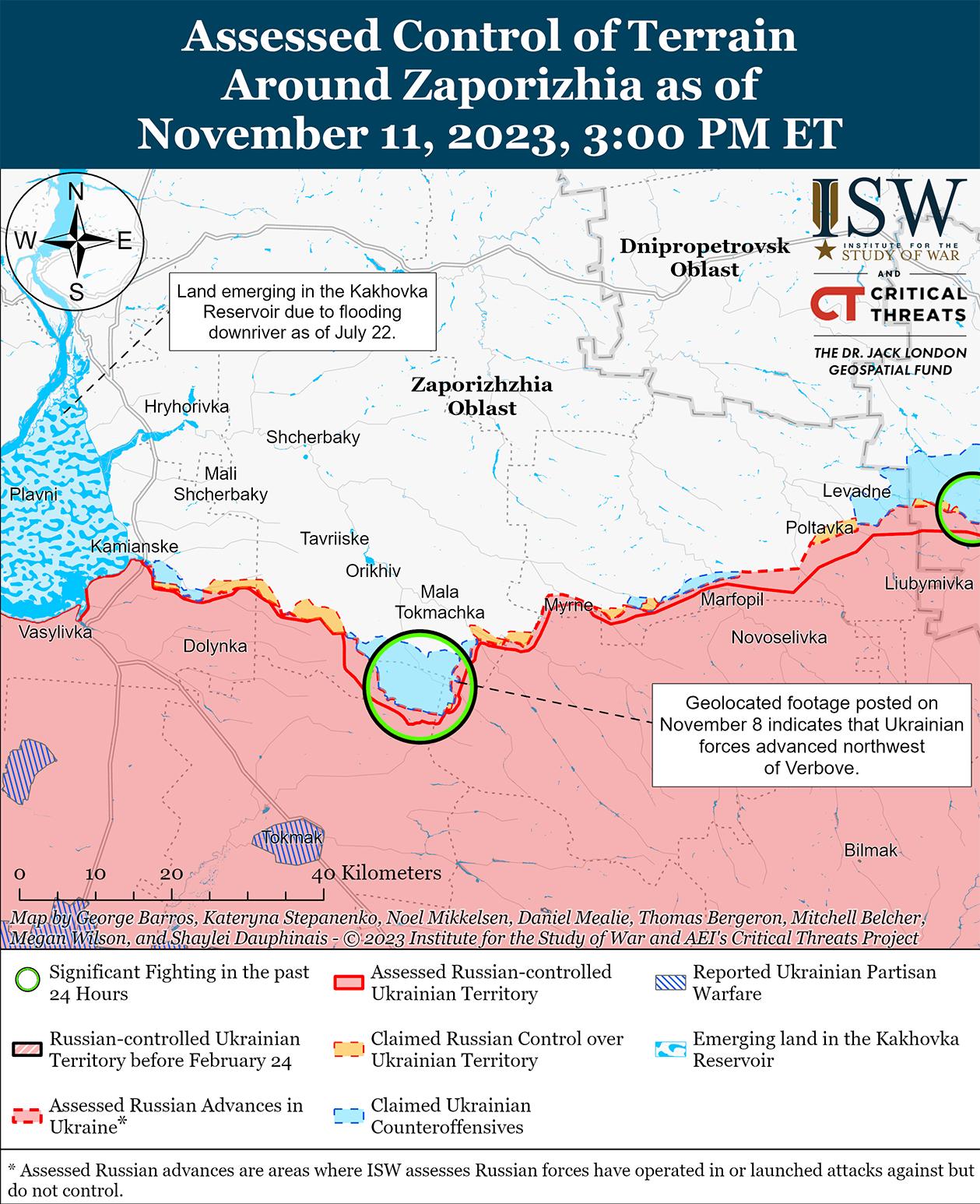 Украинские силы 11 ноября продолжили контрнаступательные операции на западе Запорожской области и, как сообщается, продвинулись вперед. Российский блогер заявил, что украинские силы атаковали северо-западнее Вербовое (10 км к востоку от Роботино) и в районе Новопокровки (13 км к северо-востоку от Роботино) и вынудили российские войска отойти с тактических высот в Вербовом и по дороге Новопокровка-Пологи.[48] Российские источники также утверждали, что российские войска отразили атаки украинской армии в районе Роботино и Копани (5 км к северо-западу от Роботина).[49] Однако ISW не обнаружила визуальных свидетельств отступления россиян из этого района. В Генштабе Украины сообщили, что украинские войска продолжают контрнаступательные действия на Мелитопольском (запад Запорожской области) направлении.[50]