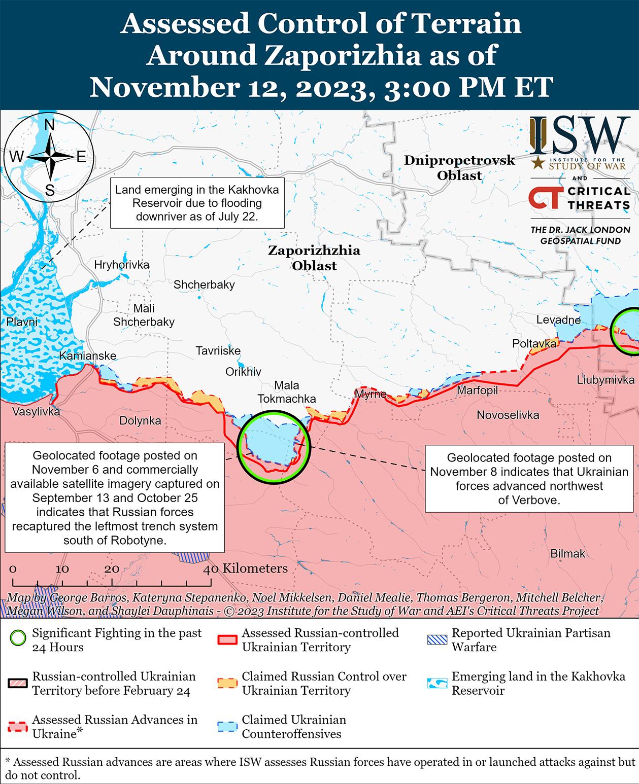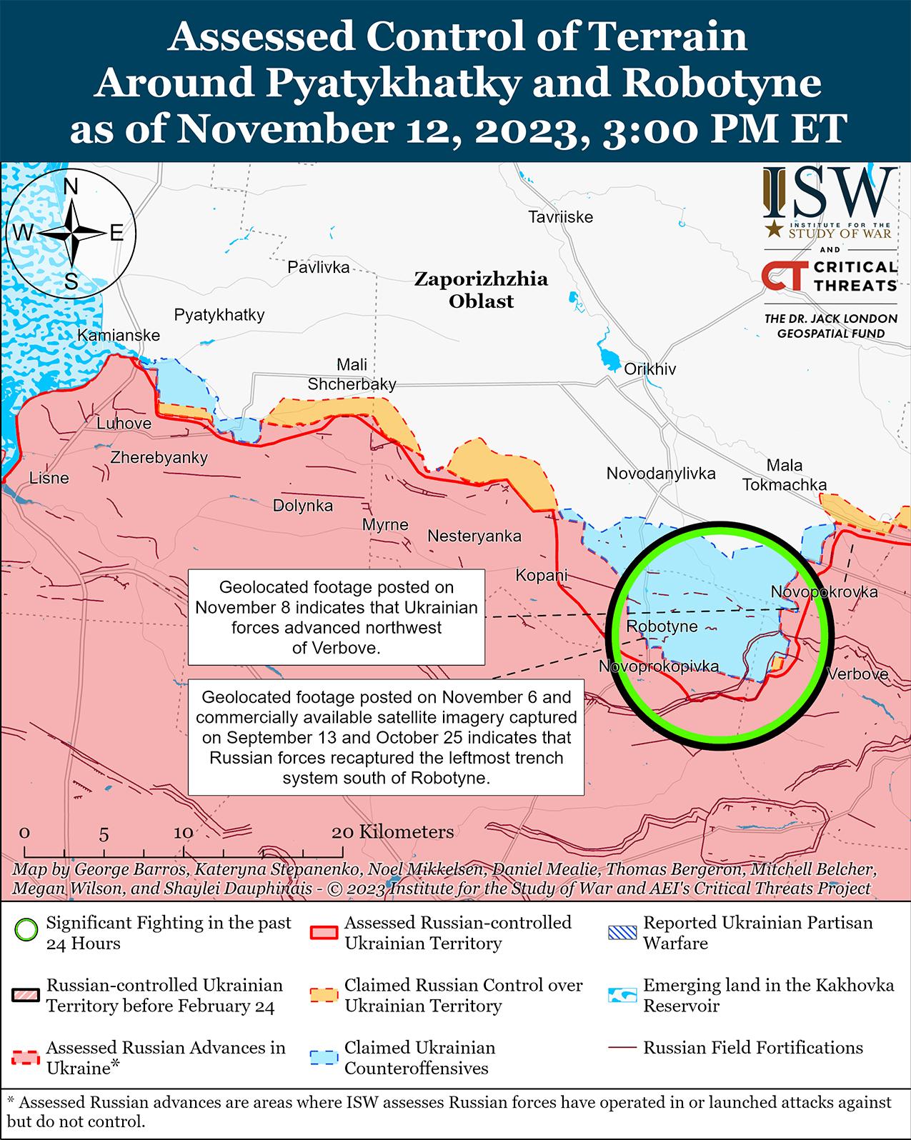 12 ноября враг продолжил наступательные действия на западе Запорожской области и добился незначительных успехов. Геолоцированные кадры, опубликованные 12 ноября, показывают, что российские войска добились незначительного успеха к северу от Копани (6 км к северо-западу от Роботино). [48] Дополнительные геолоцированные кадры, опубликованные 6 ноября, свидетельствуют о том, что российские войска недавно отбили позиции в ранее утраченных траншеях между Роботино и Новопрокоповкой. [49] Украинский Генштаб сообщал, что российские войска вели безуспешные наступательные действия вблизи Роботино. [50] Российский блогер утверждал, что подразделения 392-го мотострелкового полка (вероятно, мобилизованного) штурмуют украинские позиции в районе Пятихаток (26 км к северо-западу от Роботино), хотя североосетинские добровольческие батальоны «Штурмовая Осетия» и «Алания», действующие в районе Пятихаток, утверждали, что никакой активности вблизи населенного пункта не было. [51] Североосетинские добровольческие батальоны утверждали, что в последнее время в районе Пятихаток имели место неопределенные контратаки, что свидетельствует о некотором уровне наземной активности на участке фронта в западной части Запорожской области, который в значительной степени бездействовал с первых недель продолжающегося украинского контрнаступления. [52]