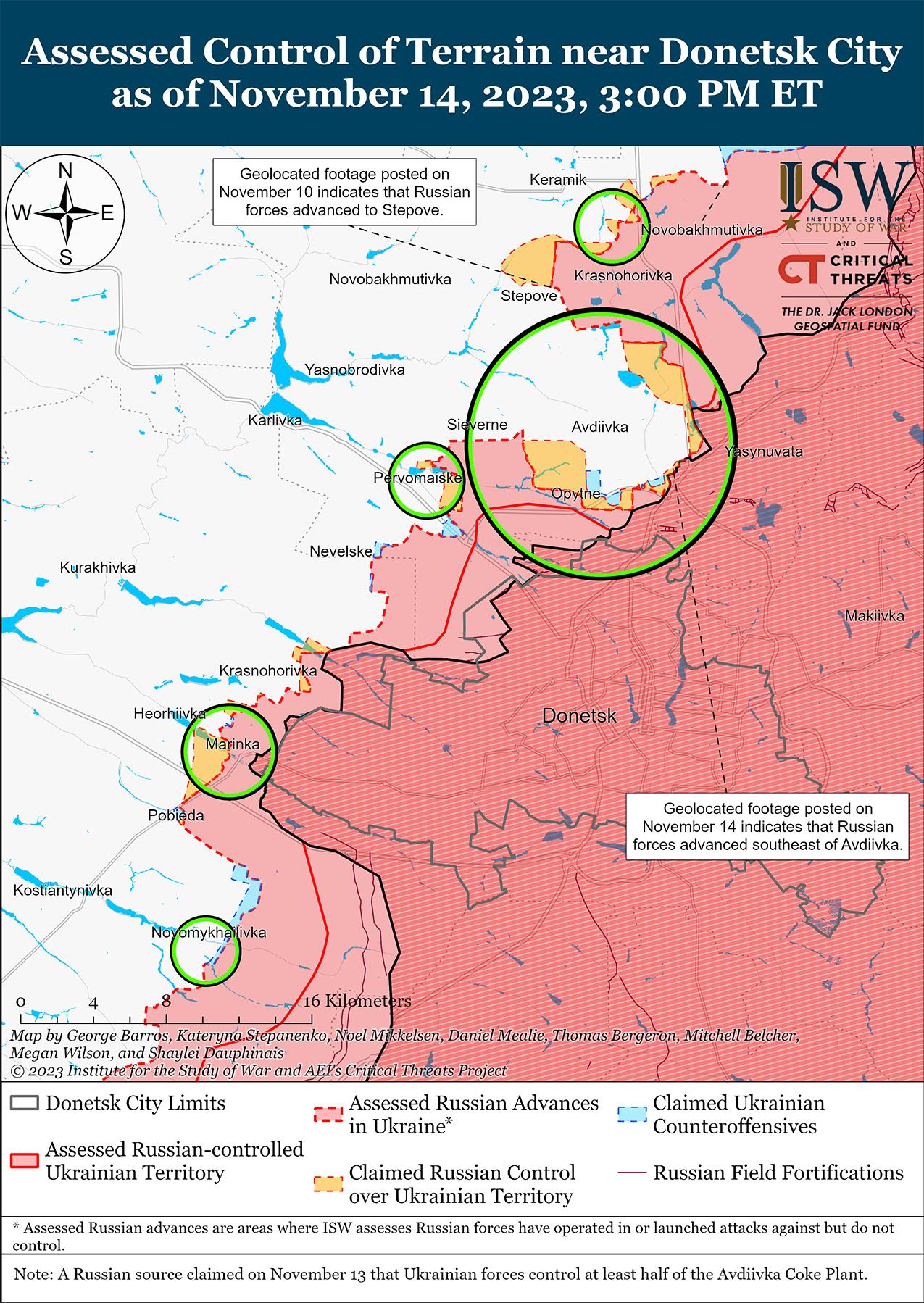 Российские войска 14 ноября продолжили наступательные действия на авдеевском направлении и добились подтвержденного продвижения. На кадрах с геопривязкой, опубликованных 14 ноября, видно, что российские войска незначительно продвинулись в промышленную зону Авдеевки в районе Яснового переулка, примерно в 1 км к юго-востоку от Авдеевки.[56] Российские военблогеры утверждают, что российские войска продолжают улучшать свои тактические позиции на восточной окраине Степового (около 4 км к северо-западу от Авдеевки).[57] Российский блогер заявил, что российские войска использовали «тактику Вагнера» при нападении на восточную часть Степового и проводили атаки небольшими группами на укрепленные украинские позиции, предполагая, что российские войска проводили лобовые атаки силами пехоты без поддержки бронетехники.[58] Другой российский военблогер заявил, что российские войска продвинулись в районе Новокалиново (7 км к северу от Авдеевки).[59] Российские источники также сообщили, что к югу от Авдеевки, вблизи промышленной зоны, идут ожесточенные бои и что 13 ноября российские войска продвинулись в районе Северного (5 км к западу от Авдеевки) и Первомайского (10 км к юго-западу от Авдеевки).[60] Украинский генеральный штаб сообщил о безуспешных атаках российских войск в районе Авдеевки, Северного, Тоненького (5 км к западу от Авдеевки), Водяного (7 км к юго-западу от Авдеевки), к востоку от Первомайского и к югу от Новокалиново.[61]