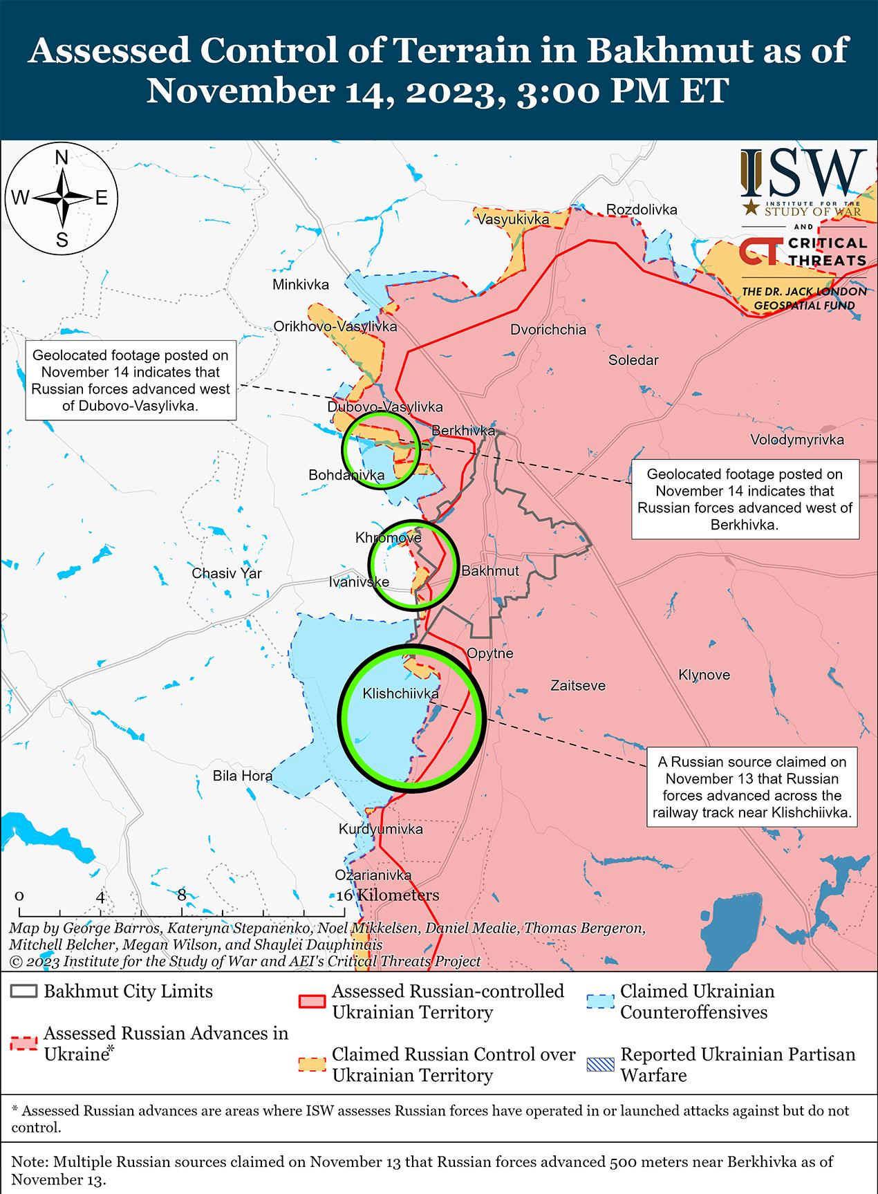 14 ноября враг продолжил наступательные действия в районе Бахмута и добился подтвержденных успехов. Геолоцированные кадры, опубликованные 14 ноября, показывают, что российские войска добились успехов к северу от Берховского водохранилища, примерно в 5 км к северо-западу от Бахмута. [44] На дополнительных геолоцированных кадрах, опубликованных 14 ноября, видно, что российские войска продвинулись на запад вдоль лесополосы к западу от Орехово-Васильевка (10 км к северо-западу от Бахмута). [45] Российские военные блогеры утверждали, что российские войска продвигаются в районе Берховского водохранилища в направлении Богдановка (5 км к западу от Бахмута). [46] 14 ноября Министерство обороны России опубликовало кадры, на которых, как сообщается, подразделения «Шторм» 98-й гвардейской воздушно-десантной дивизии (ВДВ) захватывают позиции на западном фланге Бахмута. [47] Российские военные блогеры утверждали, что российские войска также оттесняют украинские войска с позиций вблизи Клещеевки (7 км к юго-западу от Бахмута) и пытаются продвинуться в районе Андреевки (10 км к юго-западу от Бахмута). [48] Один из блогеров опроверг утверждения о продвижении российских войск в районе Клещеевки и заявил, что российские войска безуспешно атаковали в районе населенного пункта. [49] Генштаб Вооруженных сил Украины сообщил, что российские войска безуспешно атаковали вблизи Ивановское (5 км к западу от Бахмута), Клещеевки, Андреевки и Богдановки. [50] Командующий Сухопутными войсками Украины генерал-полковник Александр Сырский 14 ноября отметил, что российские войска атакуют к северу и югу от Бахмута, пытаясь вернуть себе инициативу, но сообщил, что украинские силы обороняют этот район. [51] Командир украинской роты «Ахиллес» Юрий Федоренко заявил, что ситуация на Бахмутском направлении осложнилась из-за постоянно меняющейся тактики россиян и интенсивного использования российскими войсками беспилотников. [52]