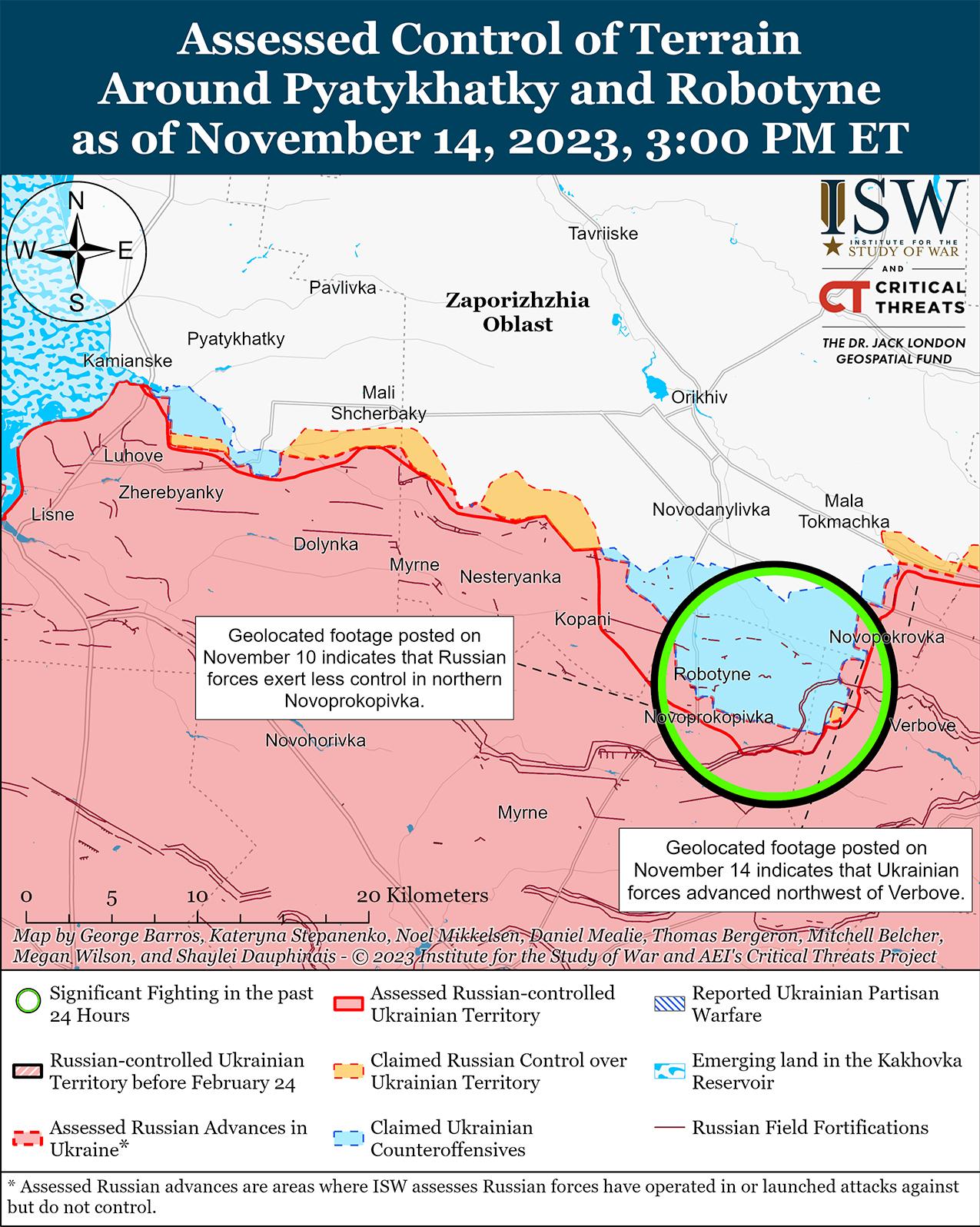14 ноября украинские войска вели наступательные действия на западе Запорожской области и подтвердили наступление. На геолоцированных кадрах, опубликованных 14 ноября, видно, что украинские силы продвинулись к северо-западу от Вербового (10 км к востоку от Роботино). [70] Генштаб ВСУ сообщил, что украинские войска продолжают наступательные действия на Мелитопольском направлении (западная часть Запорожской области). [71] Несколько российских источников утверждали, что российские войска отразили украинские атаки в районах населенных пунктов Роботино, Новофедоровка (15 км к северо-востоку от Роботино) и к северу и северо-западу от Вербового. [72] Российский военный блогер утверждал, что подразделения российского 1430-го полка (якобы состоящего из мобилизованных из Московской области), 291-го и 70-го мотострелковых полков (оба входят в состав 42-й мотострелковой дивизии 58-й общевойсковой армии Южного военного округа) отражали украинские атаки на участке Пятихатки — Роботино — Вербовое (примерно в 25 км к северо-западу от Роботино до 10 км восточнее Роботино). [73]