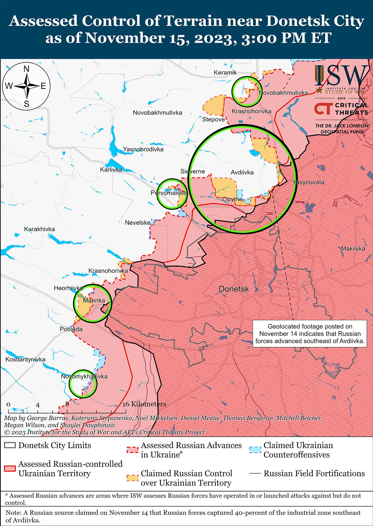 Российские источники сделали неподтвержденные заявления о том, что 15 ноября российские войска продолжали наступление в районе Авдеевки. Российский военный блогер заявил, что российские войска вытеснили украинские войска с их позиций в районе террикона к северу от Авдеевки и что российские войска захватили не менее 60% промышленной зоны к югу от Авдеевки. [41] Один российский блогер утверждал, что российские войска продвинулись к югу от террикона и захватили несколько украинских позиций. [42] Известный российский блогер утверждал, что российские войска оттеснили украинские войска от Степовое (3 км к северо-западу от Авдеевки) и что в настоящее время урегулирование оспаривается. [43] Автор добавил, что российские войска продвинулись к северу от Первомайское (11 км к юго-западу от Авдеевки), выбили украинские войска из неустановленных очистных сооружений к юго-востоку от террикона и укрепили контроль над восточной окраиной Степного, продвигаясь вдоль железнодорожного полотна. [44] Военблогер отметил, что российские войска не продвинулись в направлении Северного (6 км к западу от Авдеевки) или Тоненького (5 км к западу от Авдеевки) и не наносят прямых ударов по Авдеевке или Авдеевскому коксохимическому заводу. [45] Другой блогер утверждал, что российские войска не спешат наступать севернее Авдеевки, чтобы избежать ненужных потерь. [46] Другой российский военный блогер утверждал, что российские войска вели одновременные наступательные действия в районе Степного, Северного и Первомайского; к западу от Каменки (5 км к северо-западу от Авдеевки); рядом с водоочистной станцией; и на промышленной площадке. [47] Генштаб Вооруженных сил Украины сообщил, что украинские силы отразили атаки противника восточнее Новокалиново (11 км к северо-западу от Авдеевка) и Первомайское, а также вблизи Авдеевка, Северное, Тоненькое и Водяное (7 км к юго-западу от Авдеевка). [48]