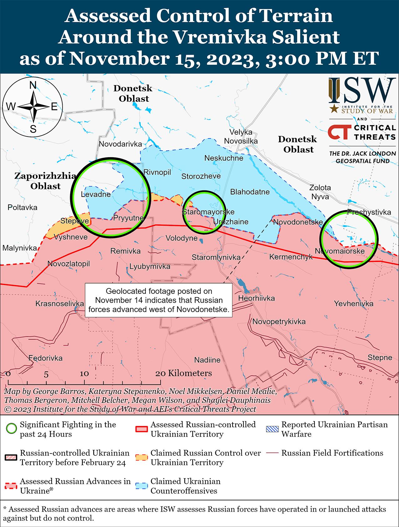 Российские войска продолжили наступательные действия в районе границы Донецкой-Запорожской областей и 15 ноября не продвинулись вперед. Генеральный штаб Вооруженных сил Украины сообщил, что враг вел безуспешные наступательные действия вблизи Старомайорское (9 км к югу от Великая Новоселка), Новодаровка (13 км к юго-западу от Великая Новоселка) Пречистовка (17 км к юго-востоку от Великая Новоселка). [56] Российские военные блогеры утверждали, что российские войска также атаковали в районах населенных пунктов Урожайное (9 км к югу от Великой Новоселки), Новодонецкое (12 км к юго-востоку от Великой Новоселки) и Новомайорское (18 км к юго-востоку от Великая Новоселка). [57] 14 ноября известный российский блогер заявил, что части 5-й общевойсковой армии России с 11 ноября безуспешно пытаются продвинуться в районе Старомайорского, а подразделения 37-й мотострелковой бригады (36-я ОА, Восточный военный округ) также недавно пытались атаковать между Урожайным и Новодонецком. [58]