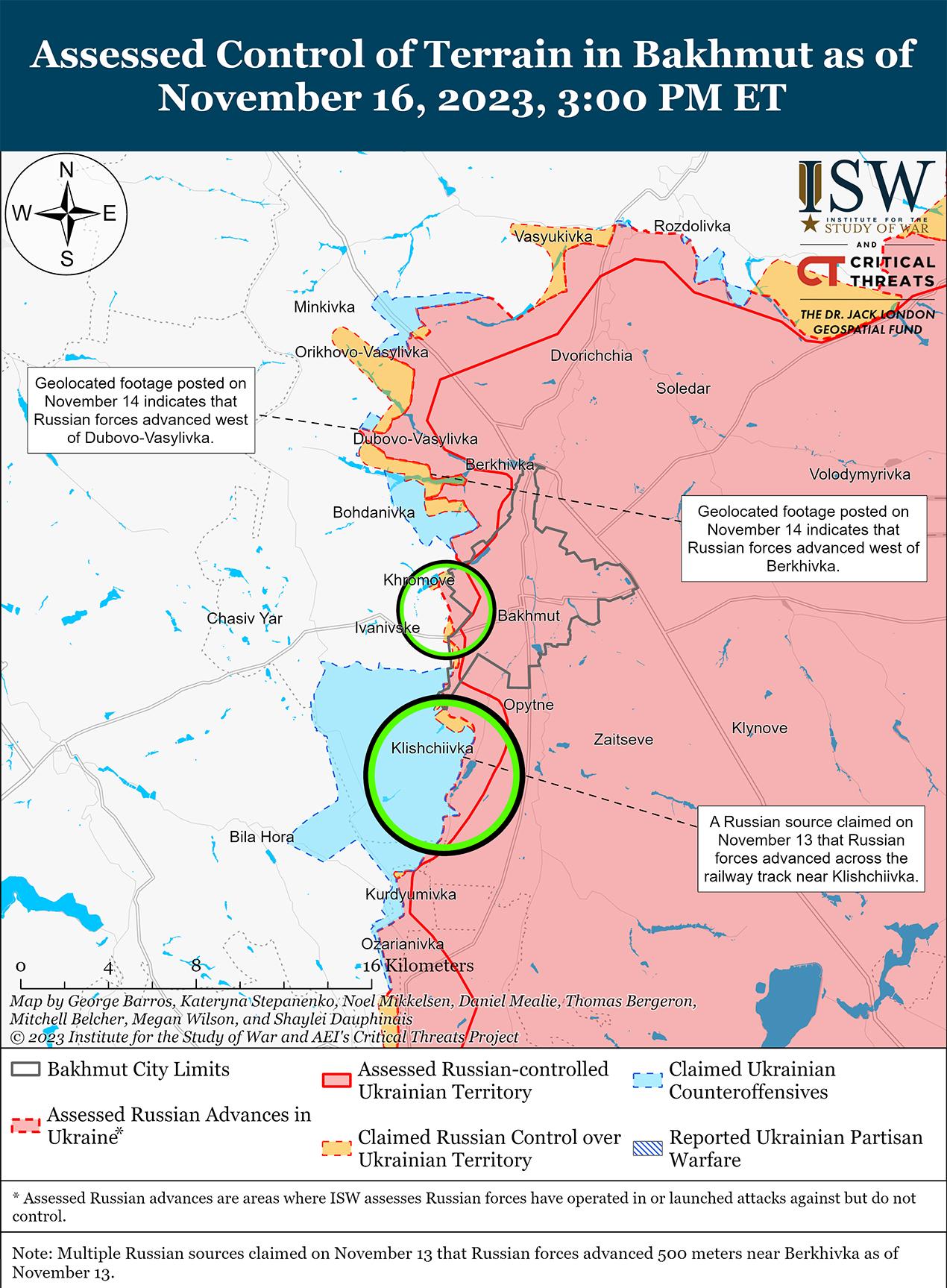 16 ноября украинские силы продолжили наступательные действия к югу от Бахмута, но не добились подтвержденных успехов. Украинский Генштаб сообщил, что украинские силы продолжают наступательные действия к югу от Бахмута. [46] Министерство обороны России заявило, что подразделения российской Южной группировки войск отразили украинские атаки в районе Бахмута и Клещеевки (7 км к юго-западу от Бахмута). [47] Российские военные блогеры утверждали, что украинские и российские войска продолжают бои за высоты в районе Клещеевки. [48] Один российский блогер утверждал, что украинские войска продвинулись к юго-востоку от Андреевка (10 км к юго-западу от Бахмута). [49] 15 ноября российские военные блогеры утверждали, что украинские войска безуспешно атаковали юго-западнее руин Майорского бетонного завода (21 км к югу от Бахмута и к западу от Горловки). [50]