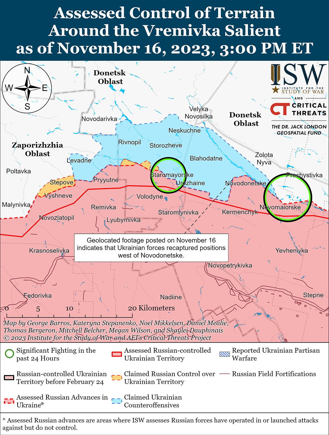 Украинские силы начали наступление на приграничном участке Донецкой-Запорожской областей 16 ноября и в неустановленную дату добились подтвержденных успехов. На геолоцированных кадрах, опубликованных 16 ноября, видно, как украинские силы отражают российские атаки к западу от Новодонецкого (12 км к юго-востоку от Великой Новоселки) и подтверждается, что украинские силы отбили некоторые позиции в этом районе в неустановленную, но, вероятно, недавнюю дату. [65]