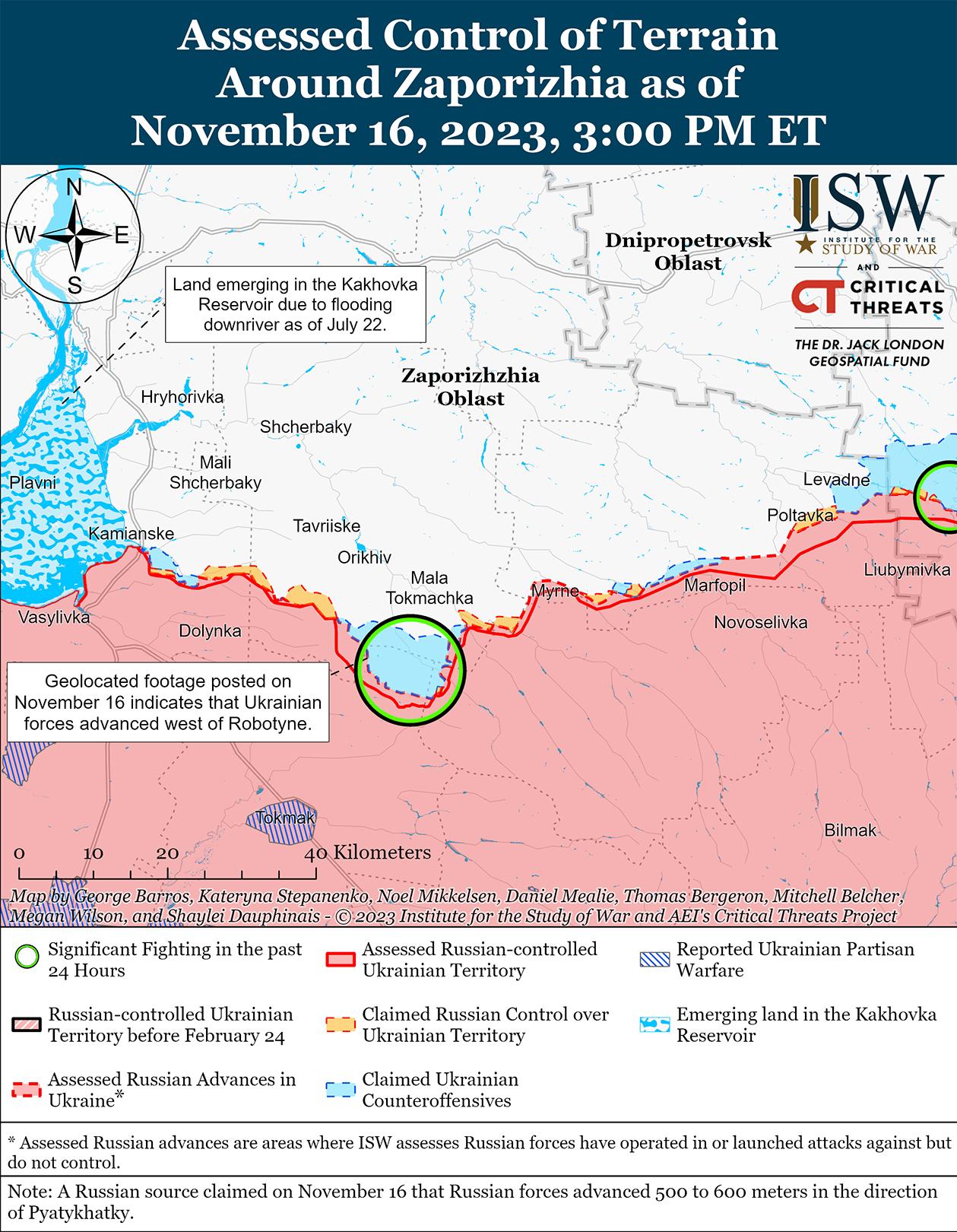 16 ноября украинские силы продолжили наступательные действия на западе Запорожской области, а 15 ноября добились подтвержденных территориальных успехов в районе населенного пункта Роботино. Российский военный блогер опубликовал и геолоцировал кадры от 15 ноября, на которых видно, как российские войска наносят удары по украинским позициям непосредственно к западу от Роботино, что указывает на незначительное продвижение украинцев. [70] Российские источники утверждали, что украинские силы безуспешно пытались продвинуться в районах населенных пунктов Копани (5 км к северо-западу от Роботино), Ровно (9 км к западу от Роботино), Новопрокоповка (непосредственно к югу от Роботино), Вербовое (8 км к востоку от Роботино) и в направлении Новофедоровки (14 км к северо-востоку от Роботино). [71] По оценке украинского военного обозревателя Константина Машовца, украинские войска, вероятно, добились определенных успехов в направлении Новопокровки (12 км к северо-востоку от Роботино) и отделены лишь одной лесополосой от населенного пункта, который оборонял российский 108-й гвардейский десантно-штурмовой полк (7-я гвардейская дивизия ВДВ). [72] Машовец добавил, что несколько дней назад украинские силовики, по-видимому, незначительно отбросили части российской 136-й отдельной гвардейской мотострелковой бригады (58-я общевойсковая армия [ОА], Южный военный округ [ЮВО]) на Копанинском направлении и продвинулись ближе к Нестерянке (10 км к северо-западу от Роботино). [73]