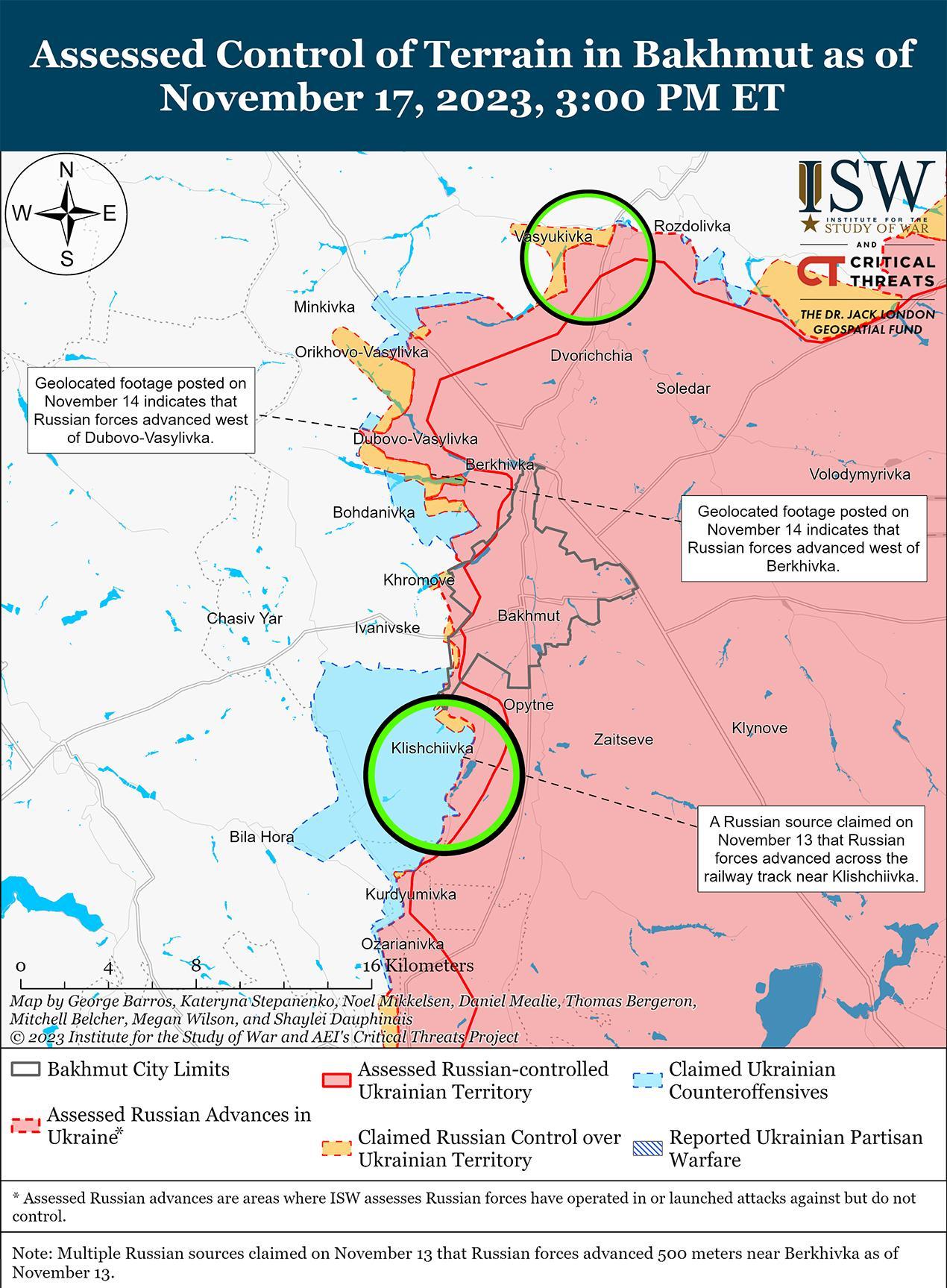 Российские войска вели наступательные действия вблизи Бахмута, но 17 ноября не добились каких-либо подтвержденных успехов. 16 и 17 ноября российские военные блогеры утверждали, что российские войска продвинулись в районе Берховского водохранилища (примерно в 2 км к северо-западу от Бахмута) в направлении Богдановки (6 км к северо-западу от Бахмута). [41] Российские военные блогеры также утверждали 16 и 17 ноября, что российские войска продвинулись в районе Клещеевки и пытаются захватить контролируемые Украиной тактические высоты к западу от населенного пункта. [42] Другие российские источники утверждали 17 ноября, что бои под Андреевкой продолжаются, а Клещеевка и Андреевка являются оспариваемыми «серыми зонами». [43] Генштаб ВСУ сообщал о безуспешных атаках вблизи Васюковка (15 км к северу от Бахмута), Ивановское (6 км к западу от Бахмута), Клещеевка и Андреевка. [44] Спикер Сухопутных войск Украины подполковник Владимир Фитё заявил 17 ноября, что на Бахмутском направлении российские войска совершили в три раза больше наземных атак, чем на Лимано-Купянском. [45] Минобороны России сообщило, что в районе Соледара (11 км к северо-востоку от Бахмута) действуют подразделения 106-й гвардейской воздушно-десантной дивизии (ВДВ), а глава Чеченской Республики Рамзан Кадыров заявил, что подразделения чеченского спецназа «Ахмат» действуют в районе Клещеевки. [46] Российский военный блогер утверждал, что на северном фланге Бахмута действуют части российской 200-й отдельной мотострелковой бригады (14-й армейский корпус, Северный флот). [47]