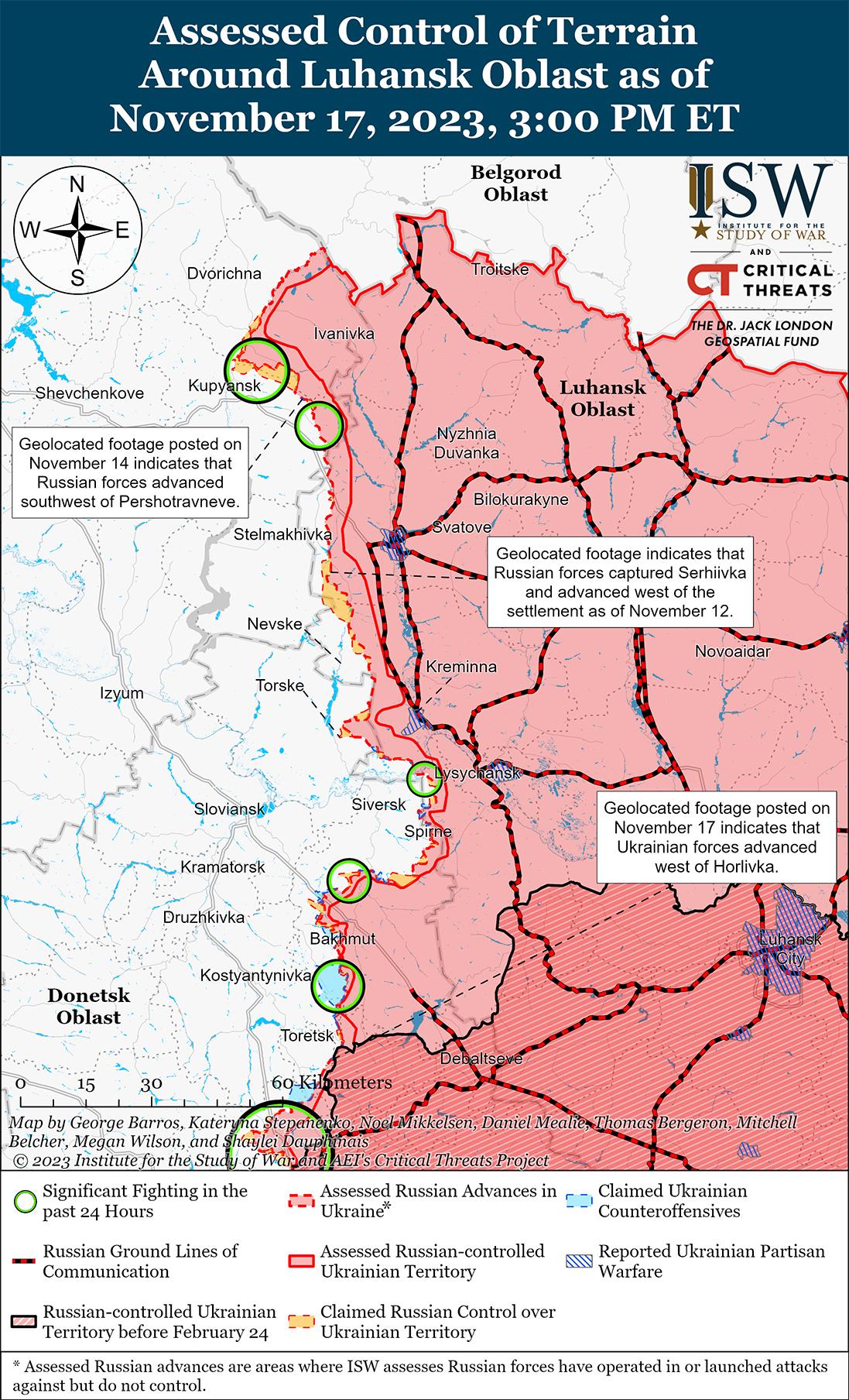 17 ноября враг вел наступательные действия вблизи Авдеевки и добился подтвержденных успехов. На опубликованных 16 ноября кадрах, которые ISW геолоцировал, видно, что российские войска незначительно продвинулись в промышленной зоне к юго-востоку от Авдеевки. [48] 16 и 17 ноября российские источники утверждали, что российские войска продвинулись в районе Степовое (3 км к северо-западу от Авдеевки), а один российский блогер утверждал, что российские войска контролируют значительную часть населенного пункта. [49] Российские источники также утверждали 16 и 17 ноября, что российские войска продвинулись к западу от Красногоровки (5 км к северо-западу от Авдеевки); в направлении Новокалиново (13 км северо-восточнее Авдеевки) и Очеретино (15 км северо-западнее Авдеевки); вблизи террикона (6 км к северо-западу от Авдеевки), Авдеевского коксохимического завода к северо-западу от Авдеевки и промзоны. [50] 17 ноября российский военный блогер заявил, что российские войска контролируют не менее 60% промзоны. [51] ISW не обнаружил визуальных подтверждений каких-либо из этих заявленных российских достижений. Генштаб Вооруженных сил Украины сообщил, что российские войска безуспешно атаковали вблизи населенных пунктов Керамик (14 км к северо-востоку от Авдеевки), Степное и Авдеевка, к востоку от Новобахмутовки (7 км к северо-западу от Авдеевки) и к югу от Тоненького (6 км к западу от Авдеевки). [52] Российский блогер утверждал, что российские войска безуспешно атаковали в районе Первомайское (10 км к юго-западу от Авдеевки). [53] 16 и 17 ноября российские источники утверждали, что бои продолжаются к югу от Северное (6 км к западу от Авдеевки); севернее Красногоровки в направлении Новокалиново; вблизи Степного, Северного, промзоны и Авдеевского коксохимического завода. [54] Российский военный блогер признал, что российским войскам все еще предстоит захватить большие территории, некоторые из которых сильно укреплены и требуют от российских войск наступления в гору, чтобы окружить и захватить Авдеевку. [55]