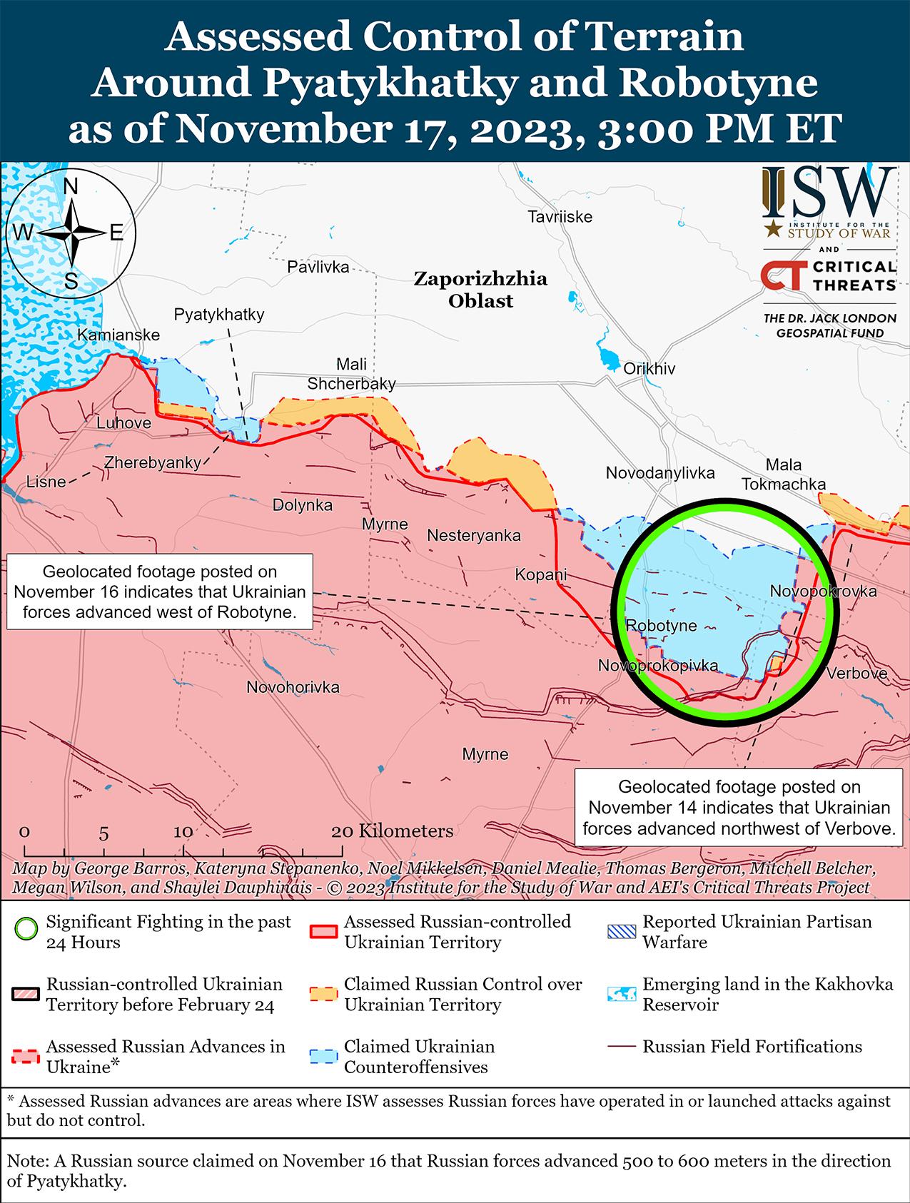 17 ноября украинские войска продолжили контрнаступательные действия на западе Запорожской области и добились незначительного подтвержденного наступления. Геолоцированные кадры, опубликованные 16 ноября, показывают, что украинские силы незначительно продвинулись к юго-западу от Роботино. [64] Российские военные блогеры утверждали, что российские войска отразили небольшие атаки украинской пехоты в районе Роботино и Вербовое (9 км к востоку от Роботино). [65] Российские источники утверждали, что 16 ноября украинские силы безуспешно атаковали российские позиции между Роботино и Копани (6 км к северо-западу от Роботино) и пытались продвинуться в направлении Новопрокоповки (3 км к югу от Роботино) и Ровно (8 км к западу от Роботино). [66] Министерство обороны России заявило, что в период с 11 по 17 ноября российские войска отразили три атаки украинских войск в районе Роботино. [67]