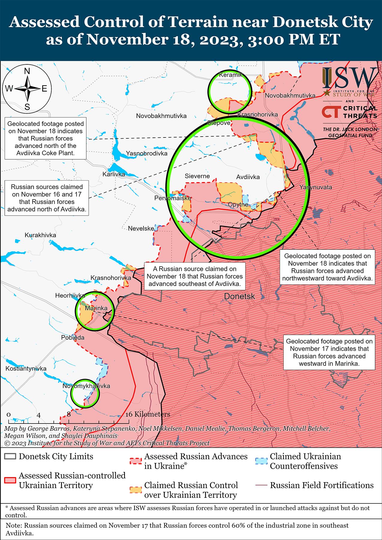 18 ноября враг продолжил наступательные действия в районе Авдеевки и добился незначительных подтвержденных территориальных успехов. На геолоцированных кадрах, опубликованных 18 ноября, видно, что российские войска незначительно продвинулись к северу от Авдеевского коксохимического завода и в промзоне на юго-восточной окраине Авдеевки. [34] Российские военные блогеры продолжали утверждать, что российские войска контролируют 60% промышленной зоны и что часть Авдеевского коксохимического завода все чаще превращается в спорную «серую зону» из-за заявлений об отступлении Украины и российских успехов. [35] Российские военные блогеры также утверждали, что российские войска захватили несколько позиций возле ресторана «Царская охота» к югу от Авдеевки и продолжают наступление к югу от террикона к северо-востоку от Авдеевки. [36] Российский блогер утверждал, что российские войска развивают успехи в районе железной дороги к северу от Авдеевки и укрепляют контроль над позициями в районе Степовое (3 км к северо-западу от Авдеевки), и отмечал, что украинские войска не отступали из промзоны к юго-востоку от Авдеевки. [37] Другой российский блогер утверждал, что российские войска продолжают наступление на Северное (6 км к западу от Авдеевки) и продвигаются в направлении Тоненького (7 км к северо-западу от Авдеевки). [38] Российские военные блогеры утверждали, что бои ведутся в основном в направлении Очеретино (15 км к северо-западу от Авдеевки), Новокалиново (11 км к северо-западу от Авдеевки) и Авдеевского коксохимического завода. [39] Генеральный штаб Вооруженных сил Украины сообщил, что украинские силы отбили российские атаки к востоку от Новобахмутовки (9 км к северо-западу от Авдеевки), Степного и Авдеевки; к югу от Тоненькое; и в районе Керамик (14 км к северо-западу от Авдеевки). [40]