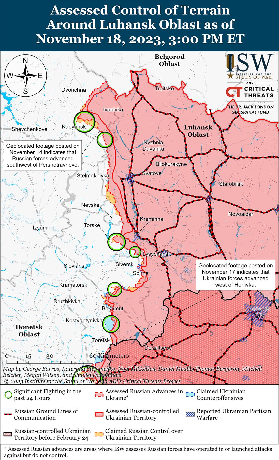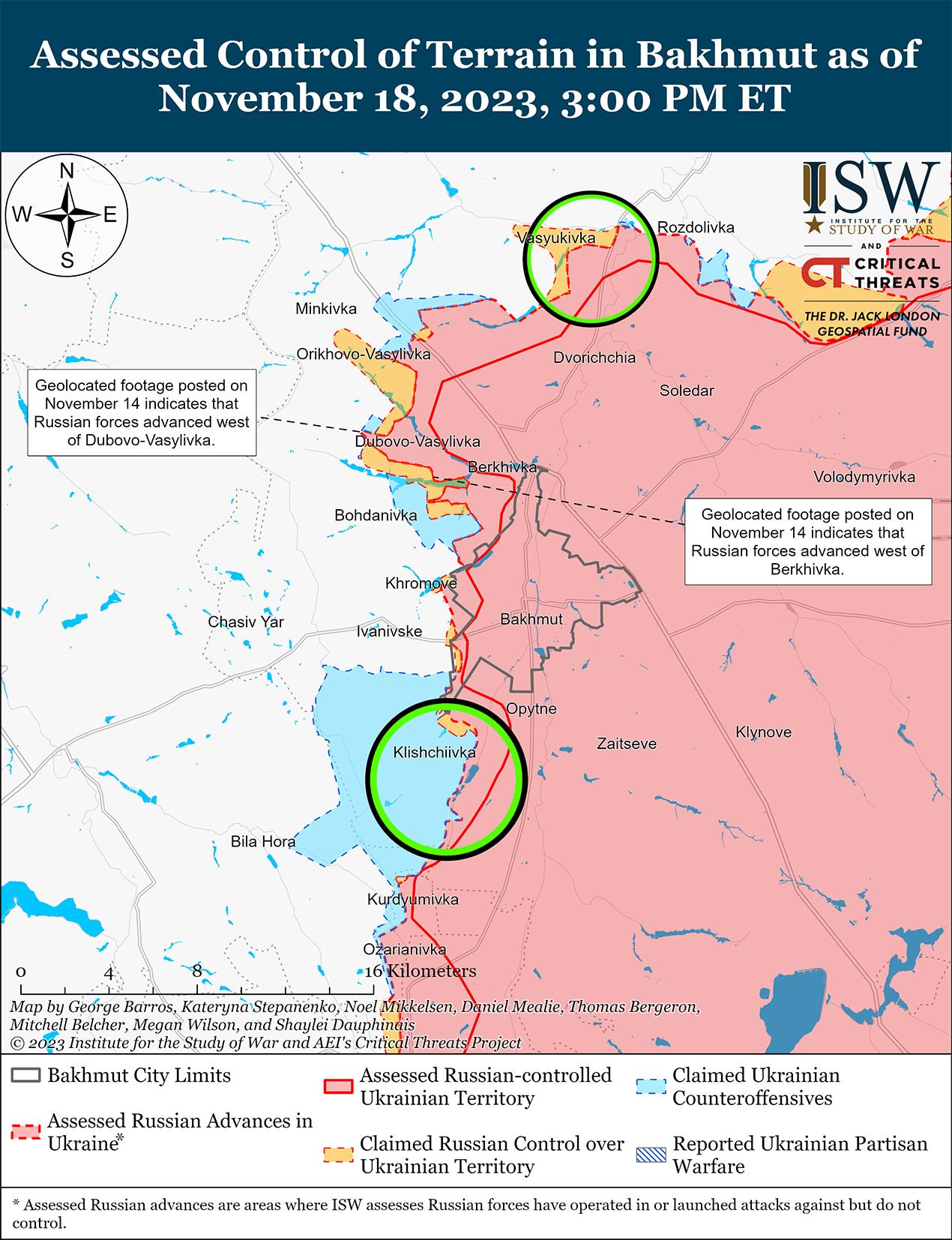 18 ноября российские войска продолжали наступление к северу и югу от Бахмута, но не добились подтвержденных успехов. Генеральный штаб Вооруженных сил Украины сообщил, что украинские силы отразили российские атаки вблизи Васюковка (16 км к северу от Бахмута), Клещеевка (7 км к юго-западу от Бахмута) и Андреевка (10 км к юго-западу от Бахмута). [30] Российские военные блогеры утверждали, что российские войска продолжают наступление на окраинах Клещеевки и успешно вытеснили украинские войска с позиций в направлении Богдановка (5 км к северо-западу от Бахмута). [31] 17 ноября один российский блогер заявил, что российские войска продвигаются вперед и зачищают районы возле Берховского водохранилища к северу от Бахмута. [32] Другой российский блогер утверждал, что российские войска незначительно продвинулись к западу от железной дороги в районе Клещеевки за последние несколько дней, и утверждал, что украинские источники сообщают о потере железнодорожной станции Клещеевка. [33]