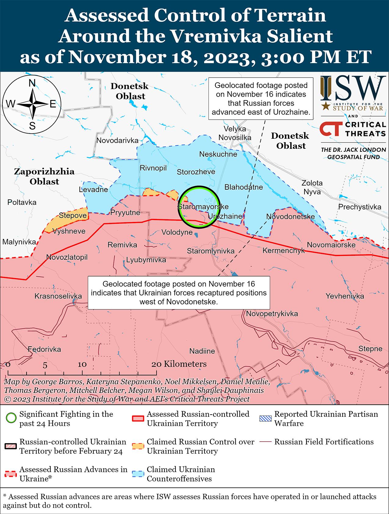 Недавно российские войска незначительно продвинулись к западу и юго-западу от Донецка в Марьинке (населенный пункт к западу от Донецка). Геолоцированные кадры, опубликованные 17 ноября, свидетельствуют о том, что российские войска добились ограниченных территориальных успехов в северо-западной части Марьинки. [42] Генеральный штаб Вооруженных сил Украины сообщил, что украинские силы отразили атаки российских войск в районах населенных пунктов Марьинка и Новомихайловка (9 км к юго-западу от Донецка). [43] Генеральный штаб Украины также отметил, что украинские силы отбили атаку южнее Водяное (5 км к северо-востоку от Угледара). [44]